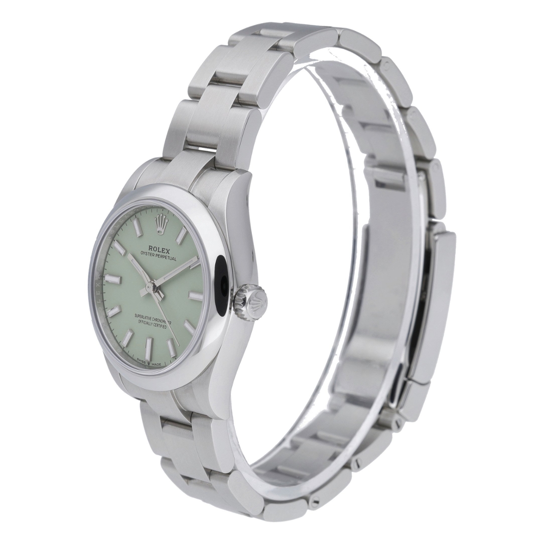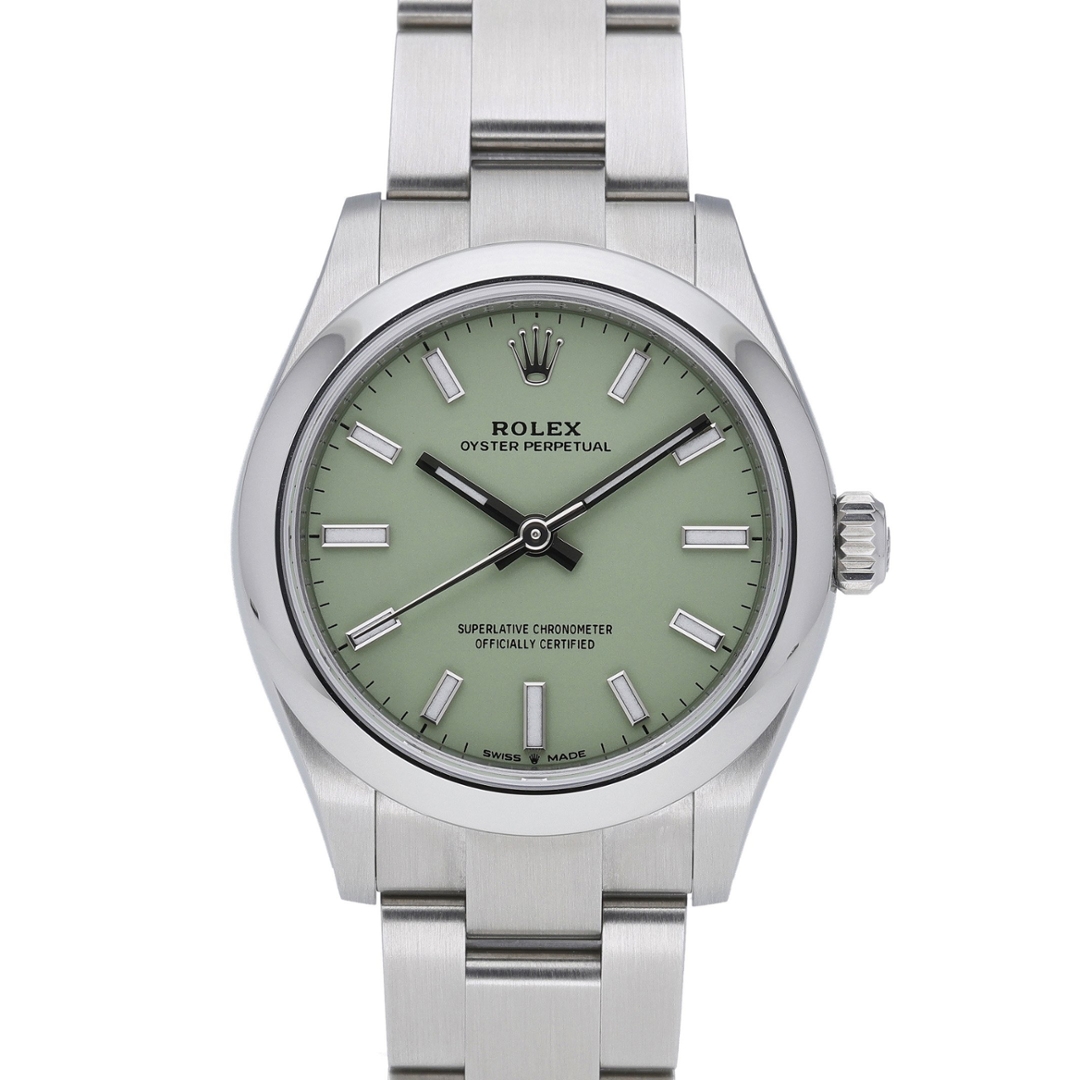 A Rolex Oyster Perpetual Watch, Stainless Steel with a Pistachio Dial.