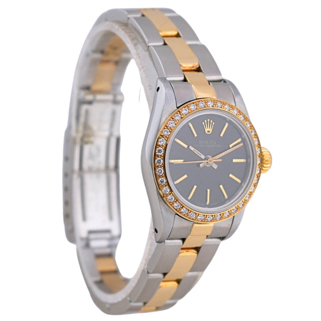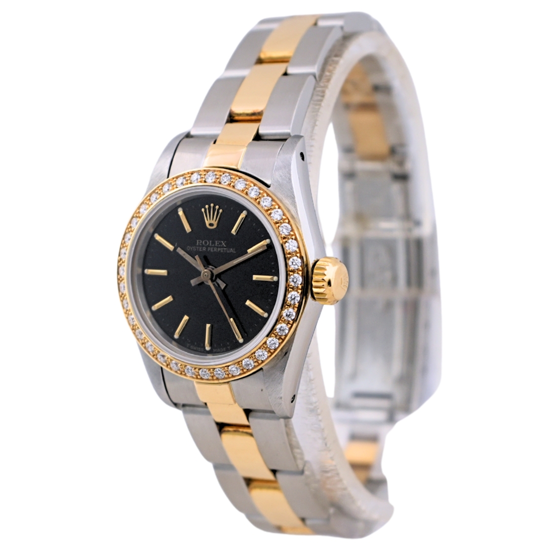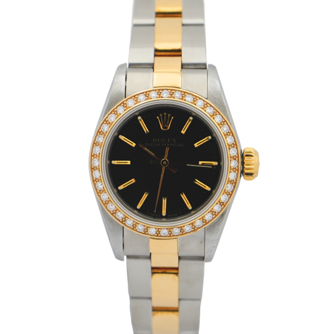 A Rolex Oyster Perpetual 67193 offers refined elegance in a compact case, crafted from stainless steel and 18ct yellow gold. This bi-metal classic is elevated with an after-set diamond bezel and a black dial featuring baton hour markers. Designed to stand out while retaining its timeless silhouette, this model blends traditional charm with a bespoke touch of luxury.