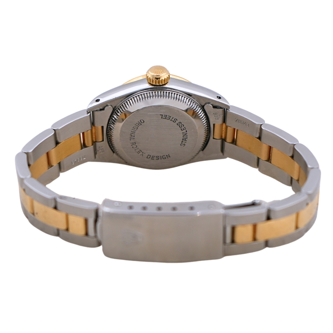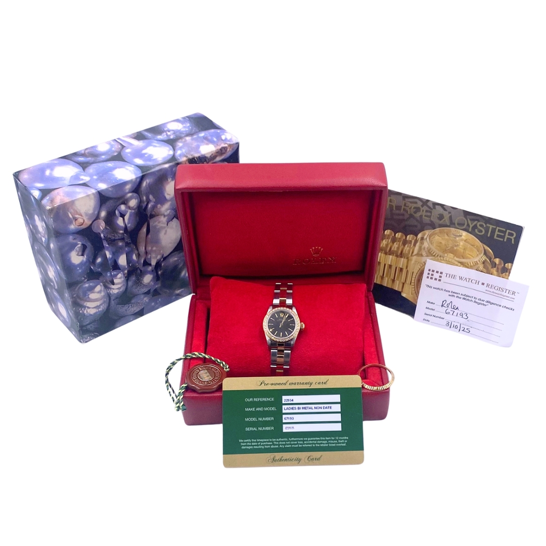 Powered by a precise Rolex automatic movement, the 67193 delivers reliable performance in a slim, graceful profile. The custom diamond-set bezel enhances its visual appeal. The Oyster bracelet, finished in two-tone steel and yellow gold, completes the design with enduring style and comfort.
