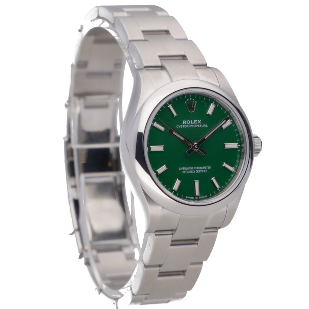 A Rolex Oyster Perpetual Watch, Stainless Steel with a Green Dial.