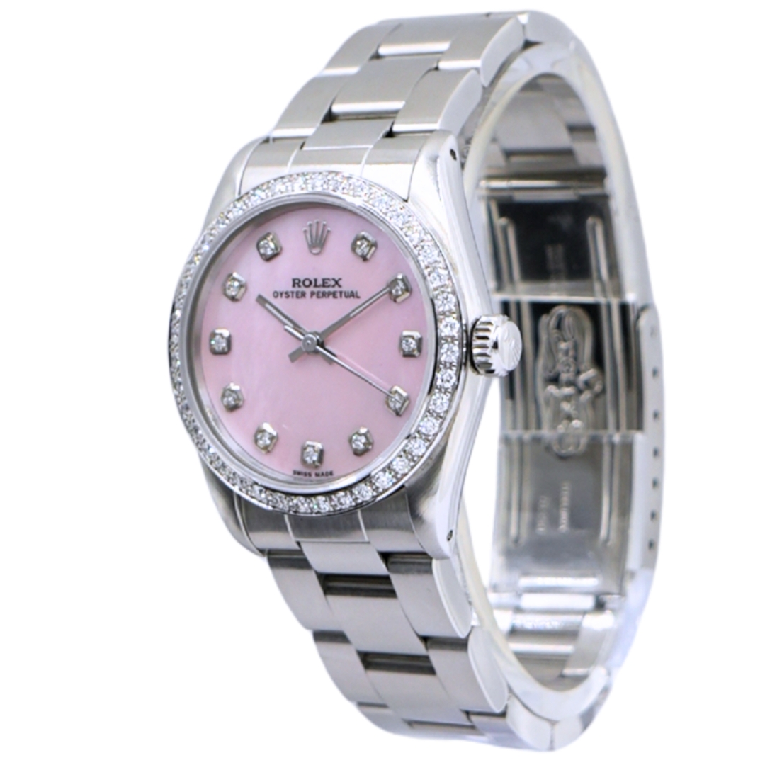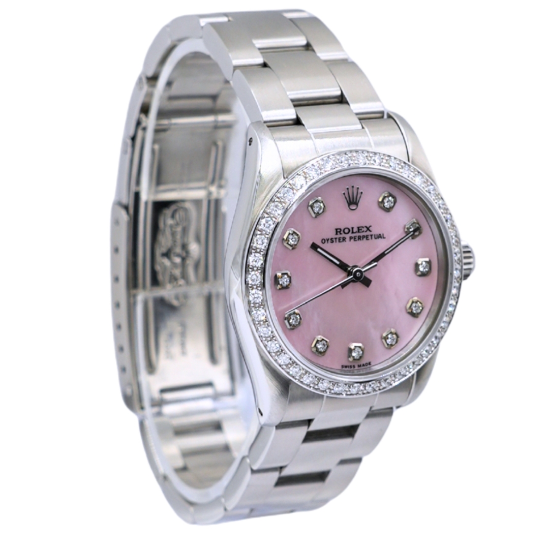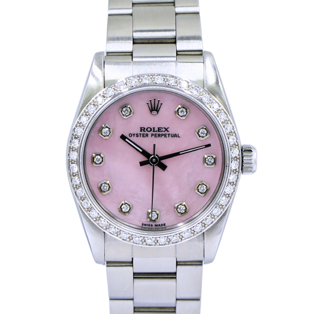 A Rolex Oyster Perpetual Watch that perfectly captures elegance and individuality. Crafted from stainless steel, this striking timepiece features a stunning afterset pink mother-of-pearl dial adorned with diamond hour markers, exuding both sophistication and charm. The watch is further enhanced by an afterset diamond bezel, adding a luxurious sparkle while maintaining the timeless character of the Oyster Perpetual design. Included with this piece are the original Rolex bezel and dial, allowing collectors to restore it to its factory specification if desired.