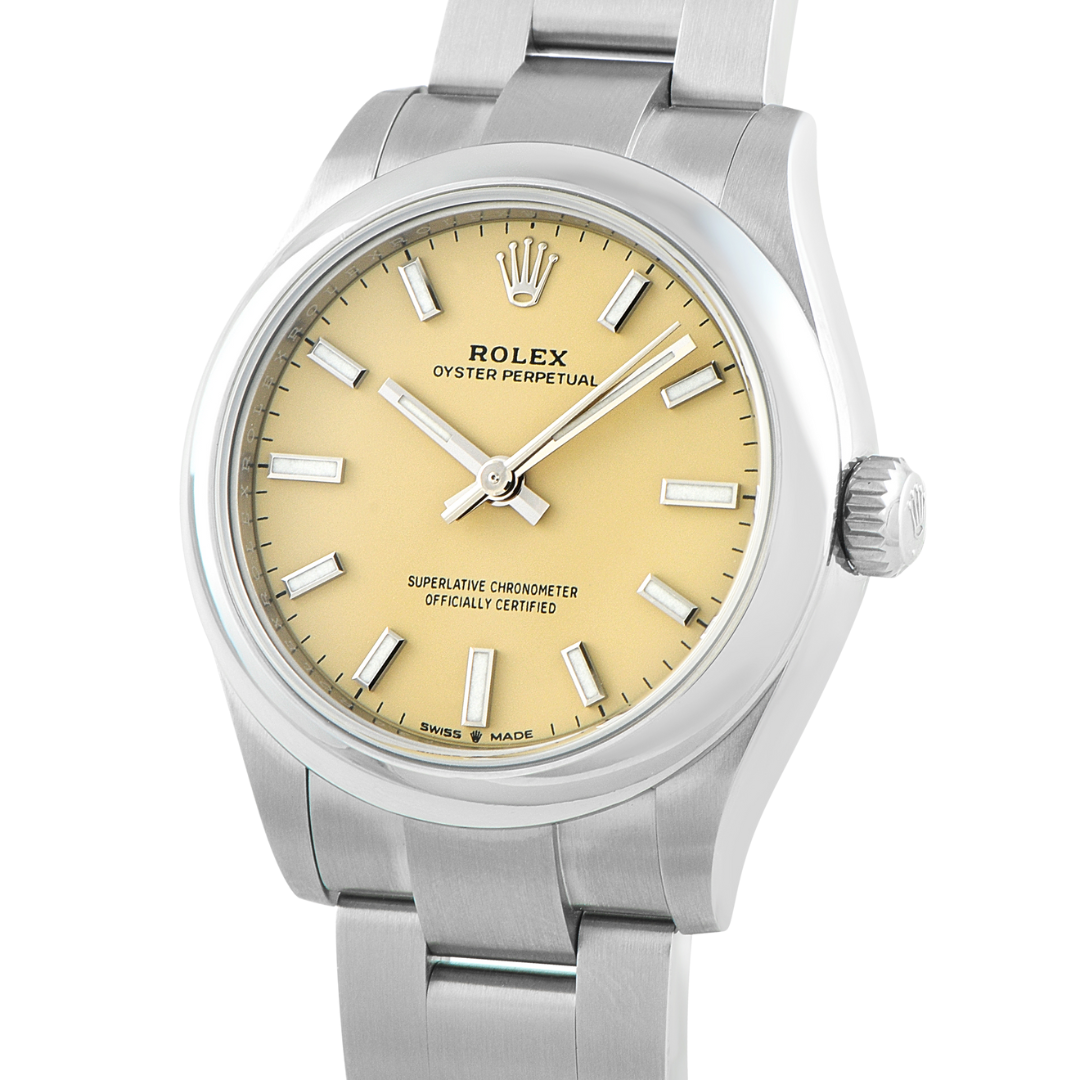 A Rolex Oyster Perpetual Watch in stainless steel, presented with a smooth bezel and a refined beige dial that brings a warm, contemporary twist to one of Rolex’s most timeless designs. The 31mm case offers a balanced and versatile profile, paired with classic baton hour markers and the signature Oyster bracelet for everyday comfort and durability.