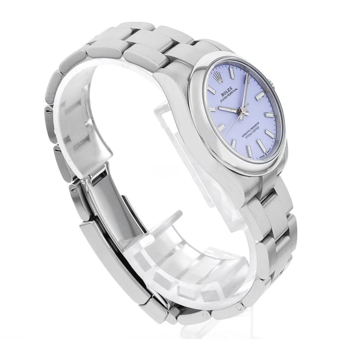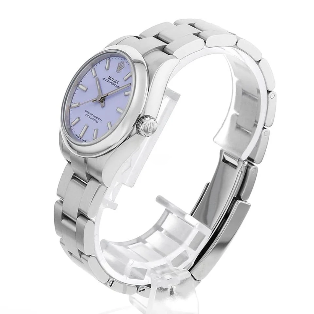 A Rolex Oyster Perpetual 277200 in 31mm brings a vibrant twist to one of Rolex’s most timeless collections. Crafted from robust stainless steel, this model features a striking Lavender dial. This bold yet elegant statement has become one of the most sought-after colourways within the Oyster Perpetual range. Its clean design is enhanced by luminous baton hour markers and a smooth Oystersteel bezel, giving the watch a sleek, contemporary feel while retaining its unmistakable Rolex DNA.