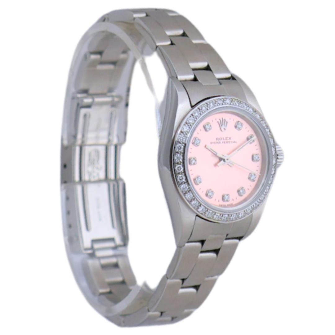 A Rolex Oyster Perpetual 76080, crafted in stainless steel and tastefully enhanced with an afterset diamond bezel and a rare salmon dial featuring afterset diamond numerals — a distinctive and elegant twist on a classic Rolex design. With a compact 24mm case, this model offers a refined, understated profile ideal for those who appreciate timeless style with a touch of individuality.
