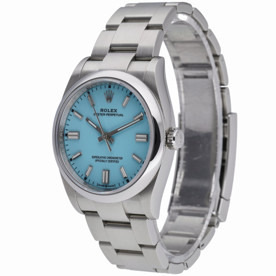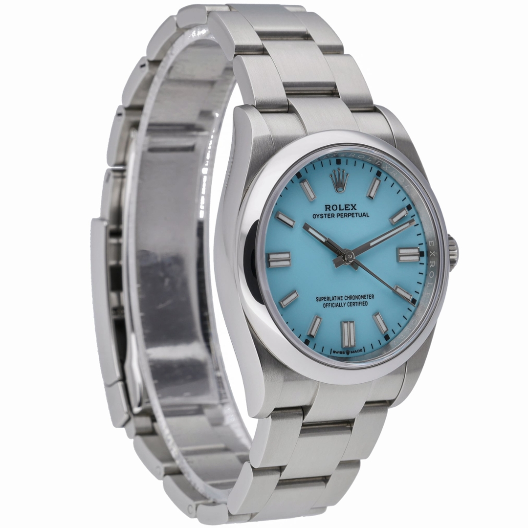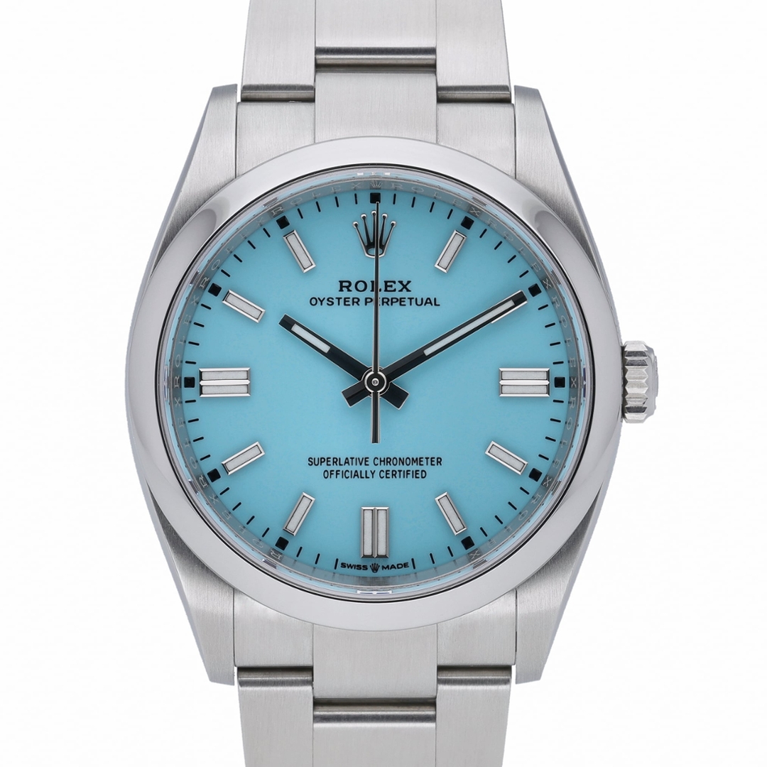 This Rolex Oyster Perpetual reference 126000 presents the modern 36mm Oyster case in stainless steel, paired with the highly sought-after Tiffany blue dial. The dial features applied baton hour markers and matching hands, delivering a clean, balanced layout that defines the Oyster Perpetual line. A smooth bezel and sapphire crystal complete the understated, contemporary aesthetic, while the Oyster bracelet reinforces the watch’s everyday versatility.