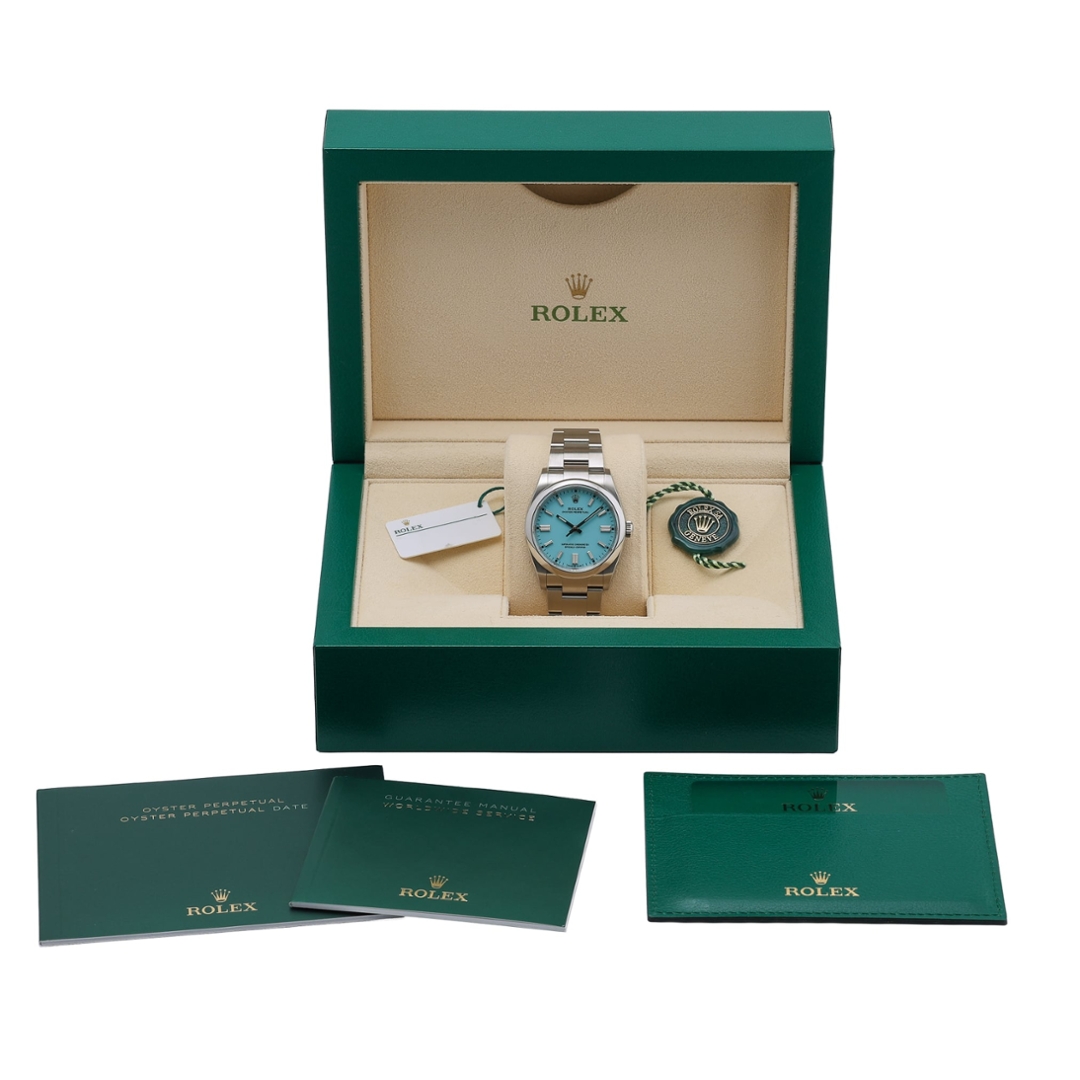 Supplied as a full set with original Rolex paperwork, this watch is boxed, certified, and covered by a 12-month WLC warranty. A highly desirable Oyster Perpetual combining iconic dial colour, modern specifications, and exceptional demand within the current Rolex market.