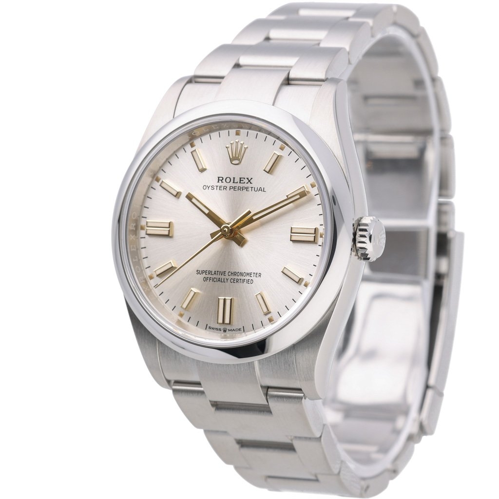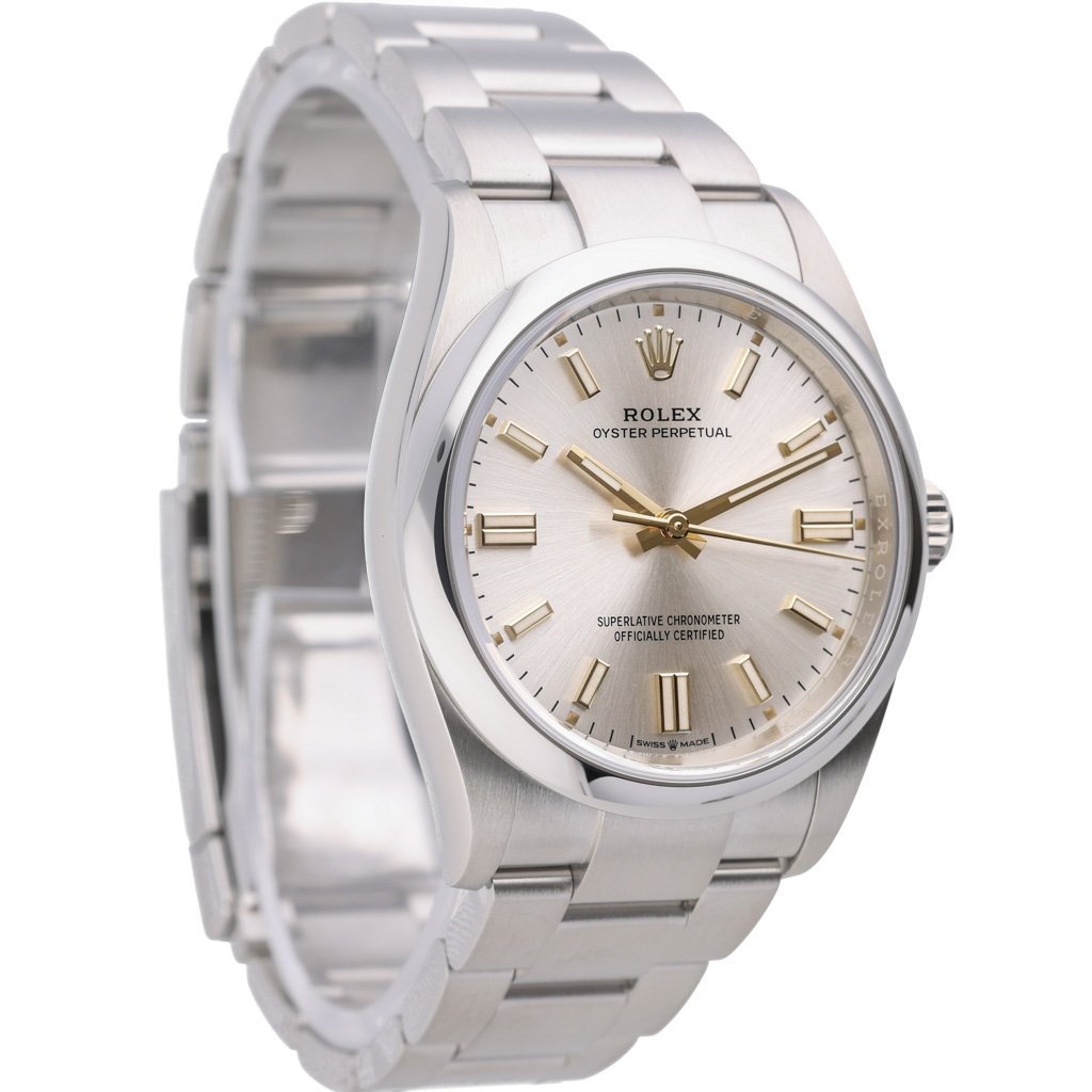 A Rolex Oyster Perpetual 126000, a true testament to Rolex’s minimalist design philosophy, combines timeless elegance with exceptional precision. Released in 2023, this stainless steel model features a 36mm case that perfectly balances wearability and presence, making it ideal for any occasion. The silver dial is understated yet striking, with its radiant finish offering subtle changes in light.