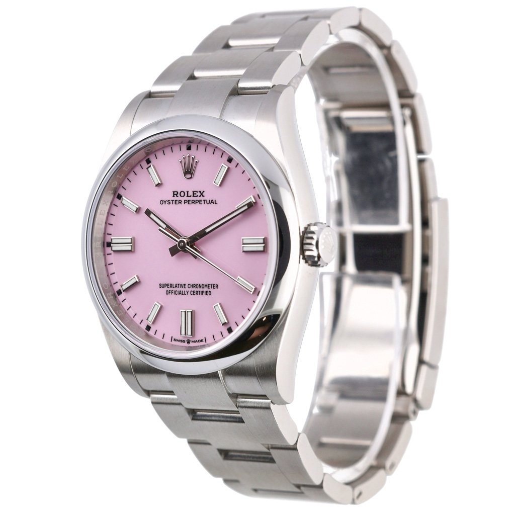 This 2025 Rolex Oyster Perpetual reference 126000 is presented in immaculate condition, featuring the highly sought-after 36mm stainless steel Oyster case paired with a soft pink dial. The balanced 36mm size remains one of the most liquid and versatile formats in the modern Rolex catalogue, appealing to both collectors and investors. The smooth bezel and Oyster bracelet create a clean, understated profile, allowing the dial colour to take centre stage while retaining everyday wearability.
