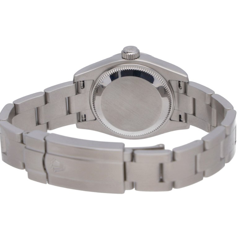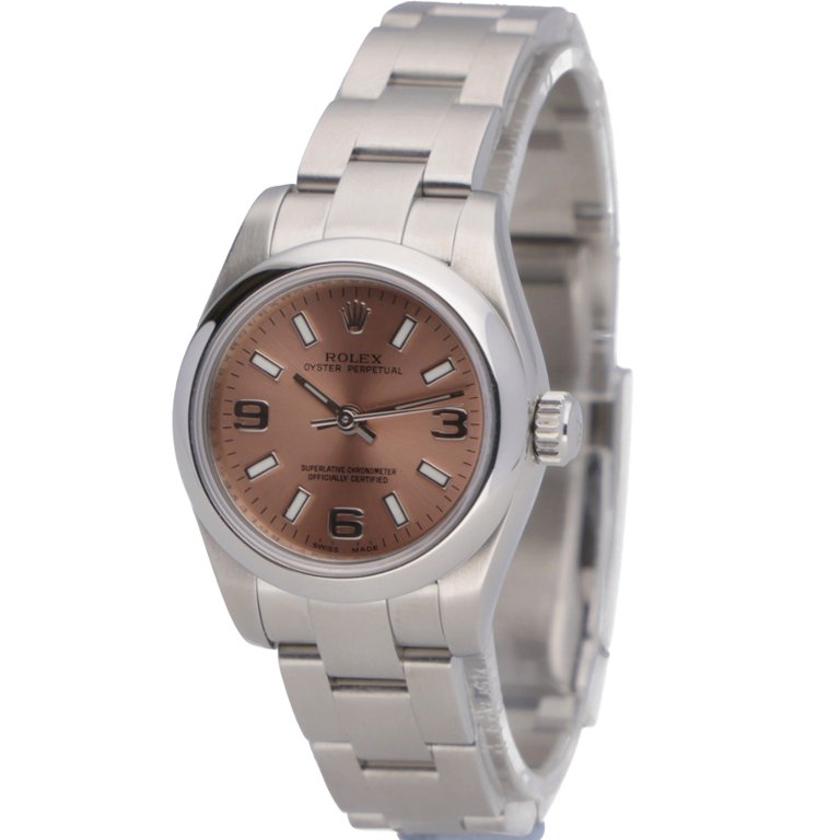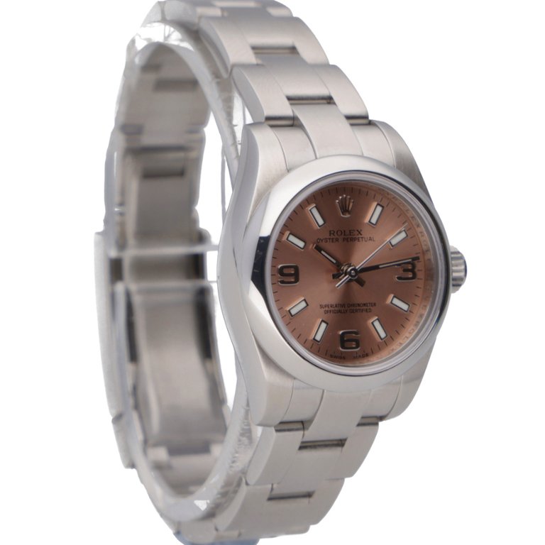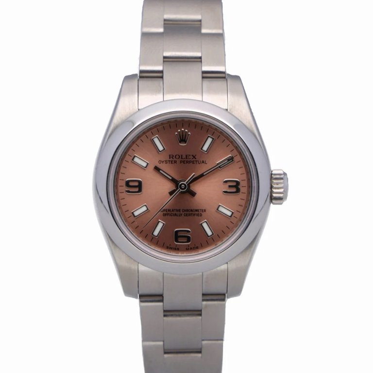 The pink dial adds warmth and individuality to this model, enhanced by applied Arabic numerals at 3, 6, and 9, luminous baton hour markers, and polished hands for balanced legibility. The smooth bezel reinforces the clean, understated aesthetic that defines the Oyster Perpetual collection. Powering the watch is the Rolex Calibre 2231 automatic movement, engineered specifically for smaller cases and built to the brand’s Superlative Chronometer standards.
