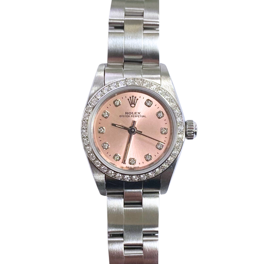 A Rolex Oyster Perpetual Watch, Stainless Steel with an Afterset Diamond Bezel on a Salmon Dial with Diamond Numerals.
