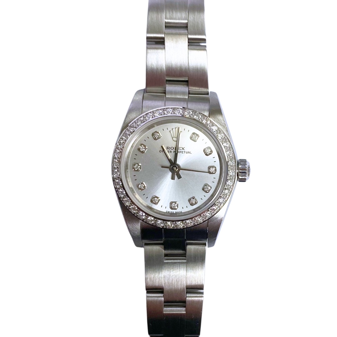 A Rolex Perpetual Watch, Stainless Steel with an Afterset Diamond Bezel on a Silver Dial with Diamond Numerals.