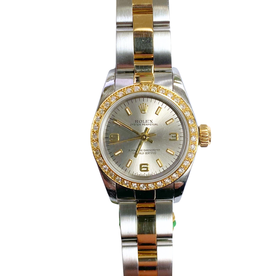 A Bi-Metal Rolex Oyster Perpetual Watch, Stainless Steel & 18ct Yellow Gold with an Afterset Diamond Bezel on a Silver Dial
