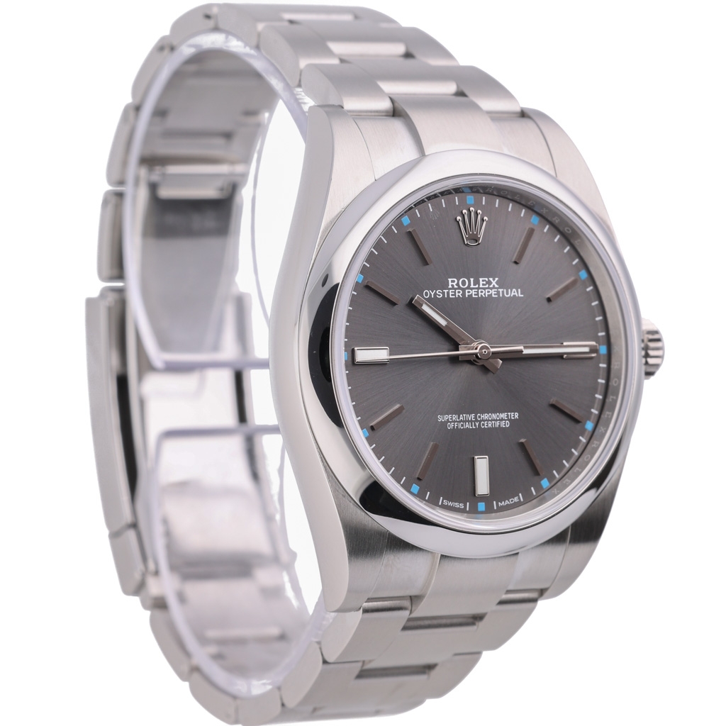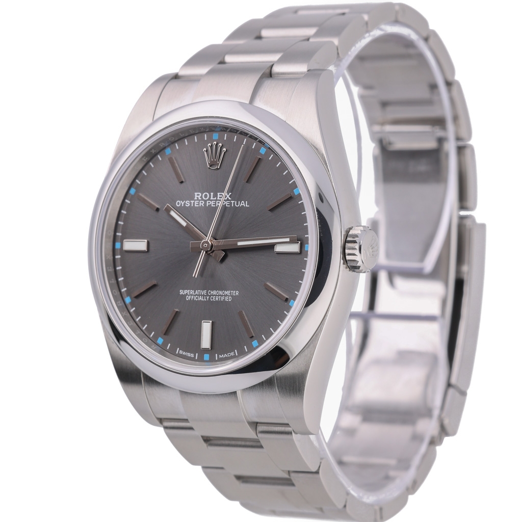 This Rolex Oyster Perpetual reference 114300 represents one of the most sought-after modern Oyster Perpetual configurations. Produced in 2019, it features the discontinued 39mm Oyster case in stainless steel, a size widely regarded as perfectly balanced and no longer available in the current range. The grey dial is elevated by distinctive blue minute markers, adding a subtle but striking contrast that gives this reference its strong collector identity.