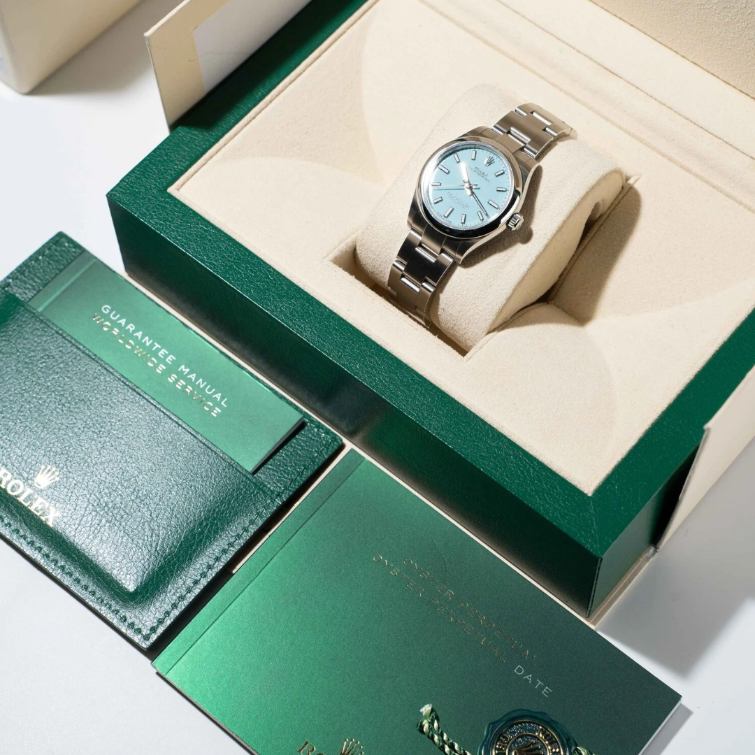 Presented in immaculate condition and accompanied by its original full set of paperwork, box, and certification, alongside Rolex manufacturer warranty coverage until 2028, this example represents a highly desirable acquisition. Turquoise dial Oyster Perpetual models continue to command strong demand, positioning this piece as a standout option with solid long-term appeal.