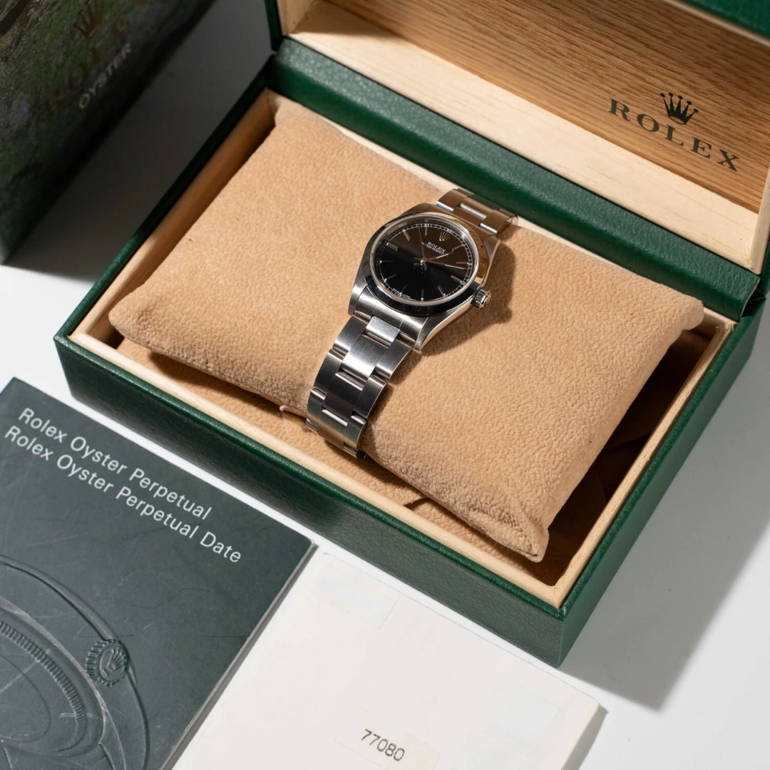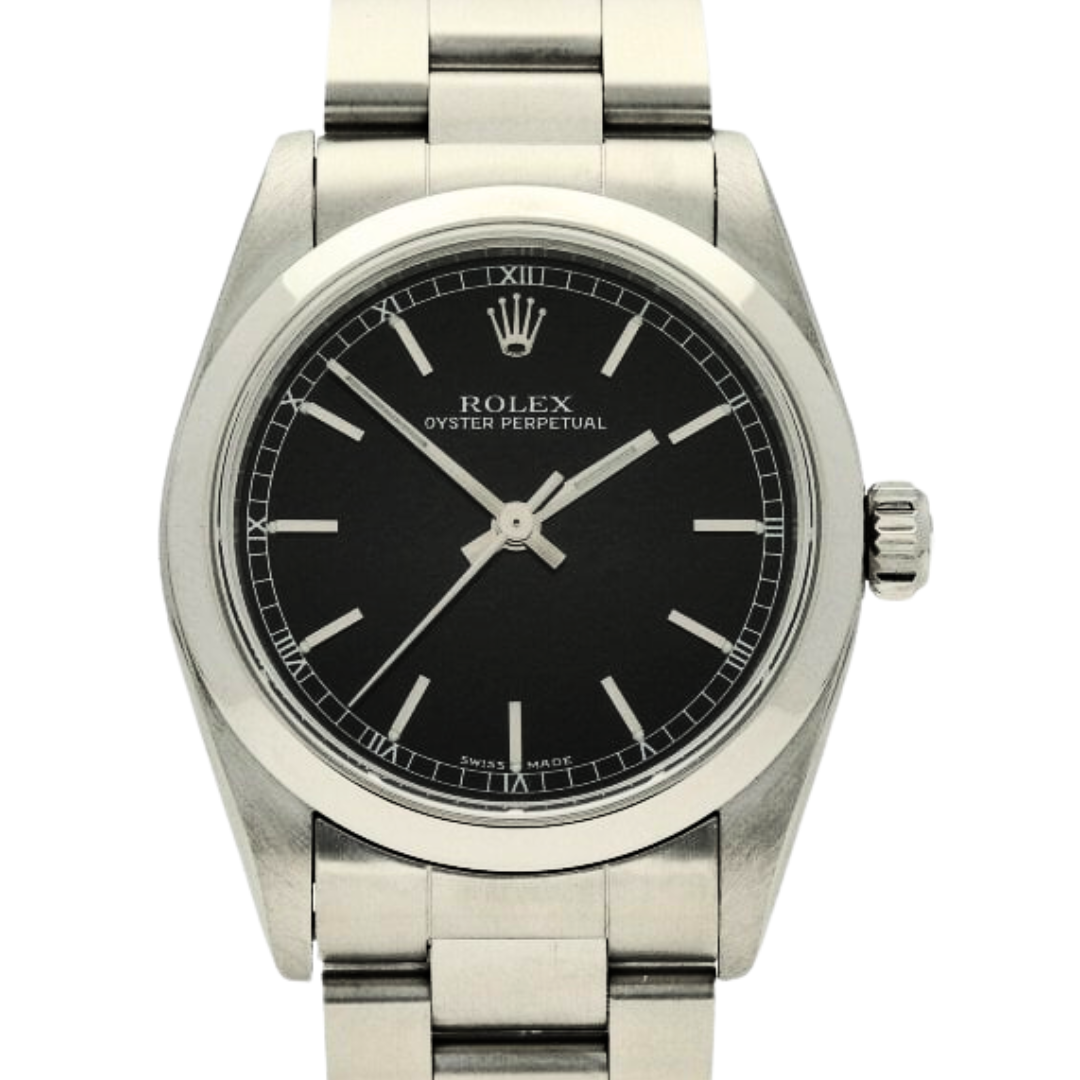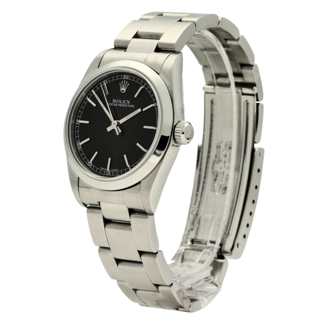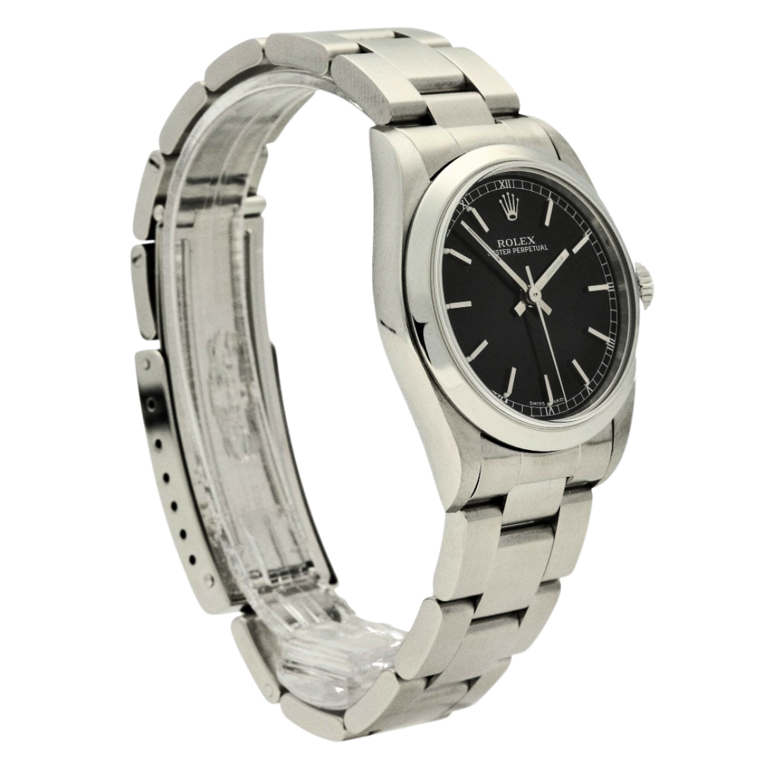 A Rolex Oyster Perpetual reference 77080 in stainless steel, featuring a deep Black dial with applied baton hour markers. The clean dial layout, paired with the smooth bezel and Oyster bracelet, creates a timeless, versatile aesthetic, making this a well-balanced everyday Rolex with subtle character.