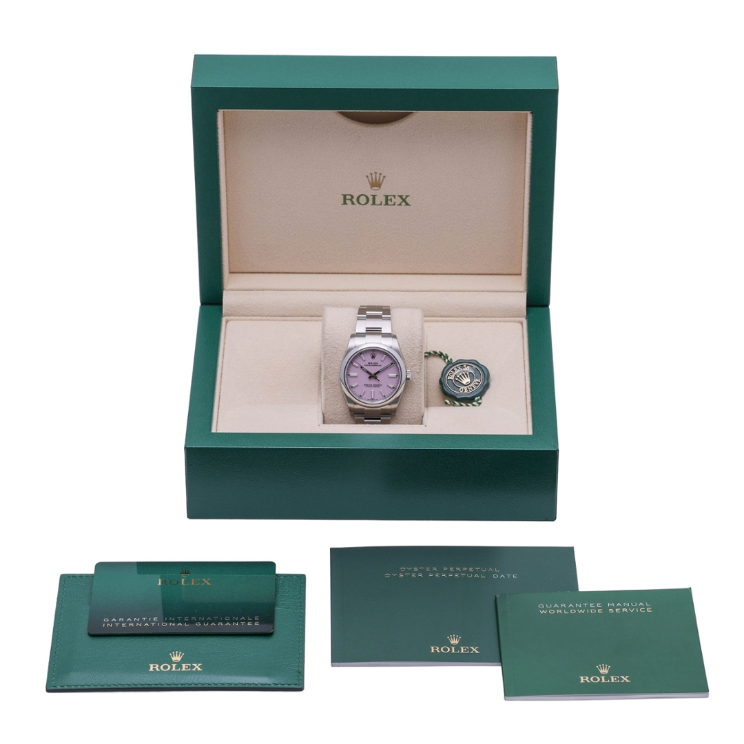 Powered by the Rolex calibre 2232 automatic movement, offering exceptional precision, robustness, and a power reserve of approximately 55 hours. The Oyster Perpetual line represents the purest expression of Rolex design, combining simplicity, durability, and everyday wearability in a versatile 34mm case size.