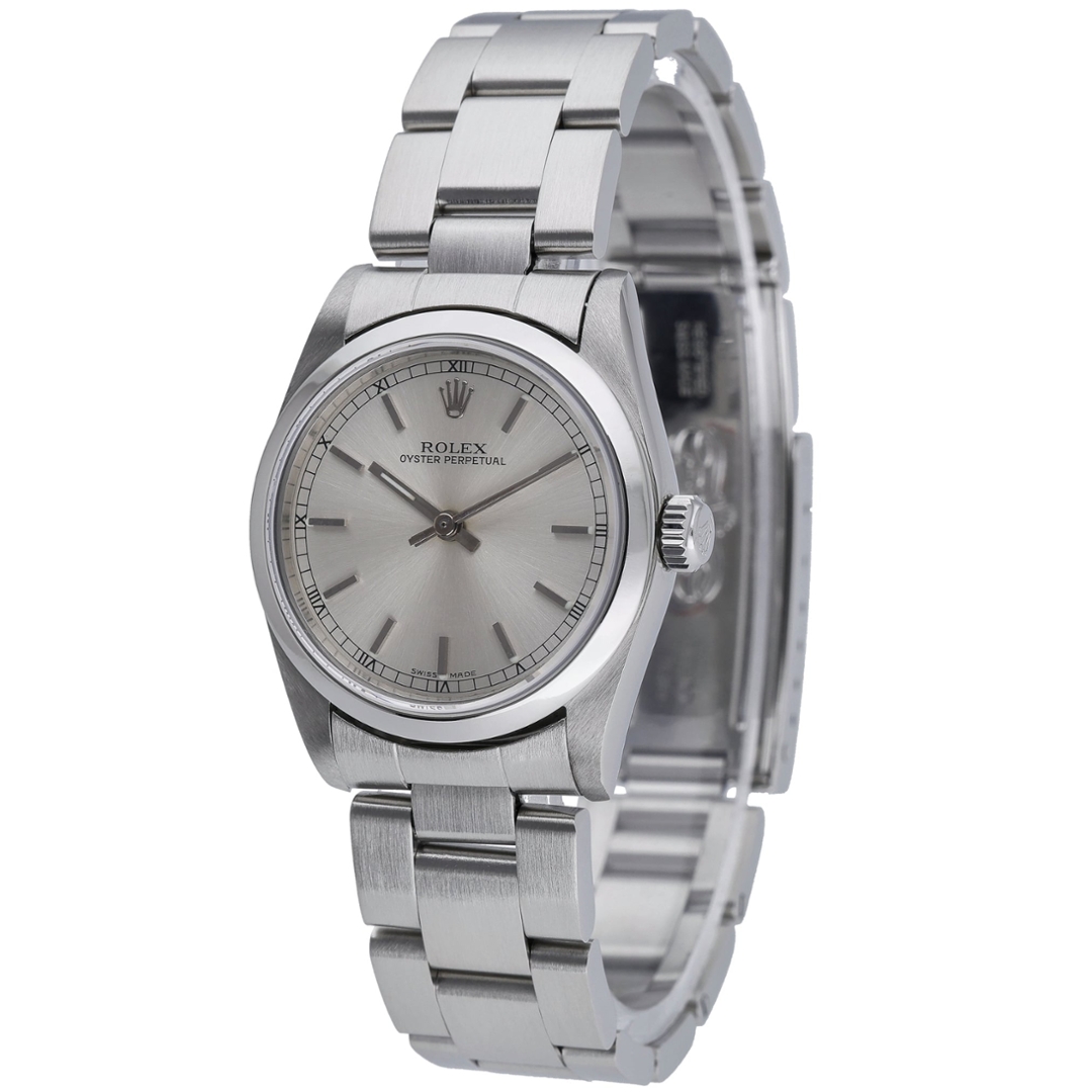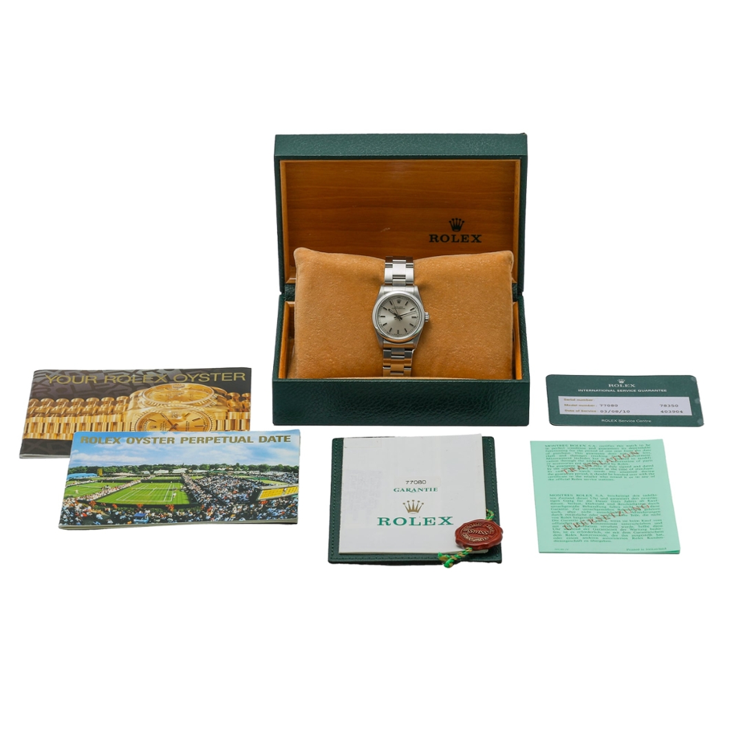 A Rolex Oyster Perpetual reference 77080 in stainless steel, featuring a deep Silver dial with applied baton hour markers. The clean dial layout, paired with the smooth bezel and Oyster bracelet, creates a timeless, versatile aesthetic, making this a well-balanced everyday Rolex with subtle character.