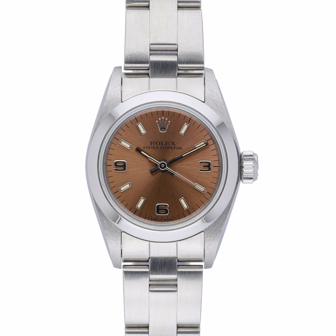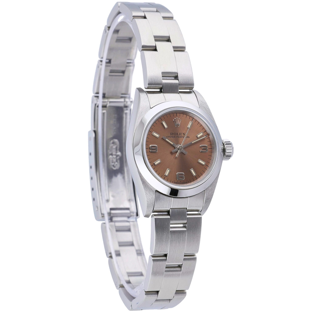 A Rolex Oyster Perpetual in stainless steel, presented with a highly desirable salmon-toned dial that offers a distinctive and understated aesthetic. The 26mm case delivers classic proportions, while the smooth bezel and Oyster bracelet maintain the model’s clean, versatile profile. The warm dial tone is complemented by applied Arabic and baton hour markers, creating a subtle contrast that enhances legibility.