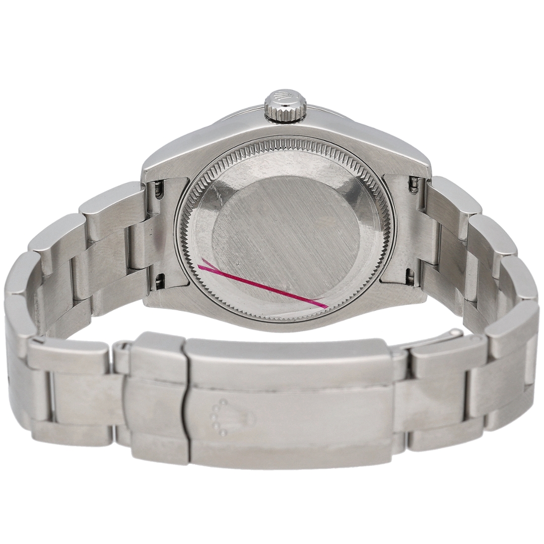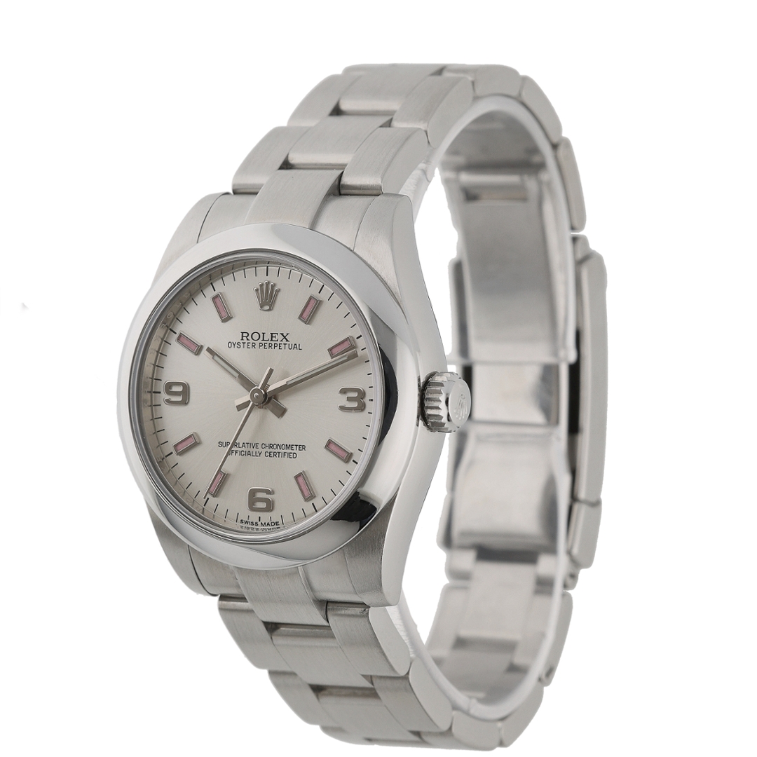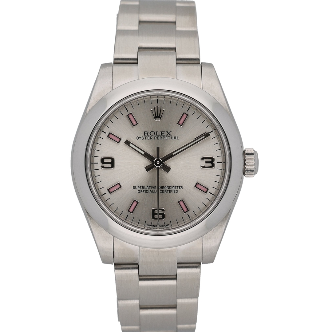 A Rolex Oyster Perpetual, model 177200, is presented in stainless steel with a well-proportioned 31mm case. The smooth bezel and Oyster bracelet create a clean, understated aesthetic, while the silver dial offers a refined and contemporary look. Subtle pink baton hour markers add a distinctive touch, giving the watch a unique character without compromising its timeless appeal.