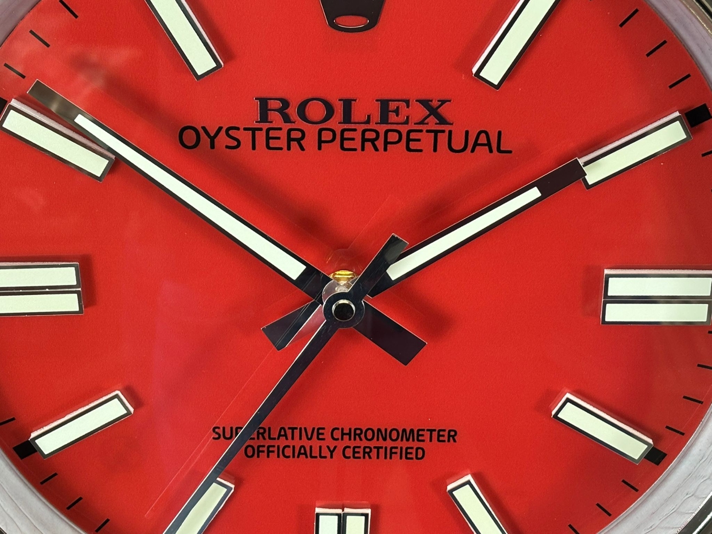 A stainless steel replica Rolex Oyster Perpetual wall clock, featuring a bold red dial that delivers a striking and contemporary take on a classic design. The clean, minimalist layout is complemented by baton-style hour markers and sleek hands, creating a strong visual presence while maintaining the timeless simplicity that defines the Oyster line.