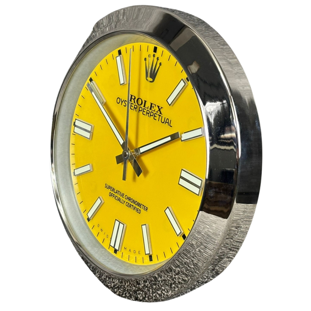 A stainless steel replica Rolex Oyster Perpetual wall clock, featuring a bold yellow dial that delivers a vibrant and contemporary take on a classic design. The clean, uncluttered layout is complemented by baton-style hour markers and sleek hands, creating a striking yet balanced aesthetic that stands out instantly while maintaining the timeless appeal of the Oyster collection.