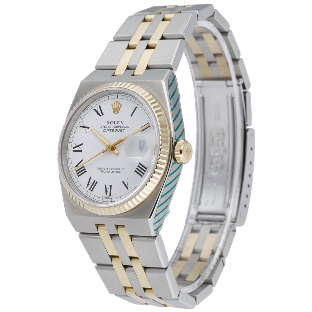 A bi-metal Rolex Oysterquartz Datejust, crafted in stainless steel and 18ct yellow gold, this reference 17013 delivers one of the most distinctive profiles in Rolex history. The sharp, angular case architecture and integrated bracelet, while the yellow gold fluted bezel adds classic Rolex presence. The white Roman numeral dial offers clean symmetry and strong legibility, giving the model a timeless elegance that separates it from traditional Datejust references.
