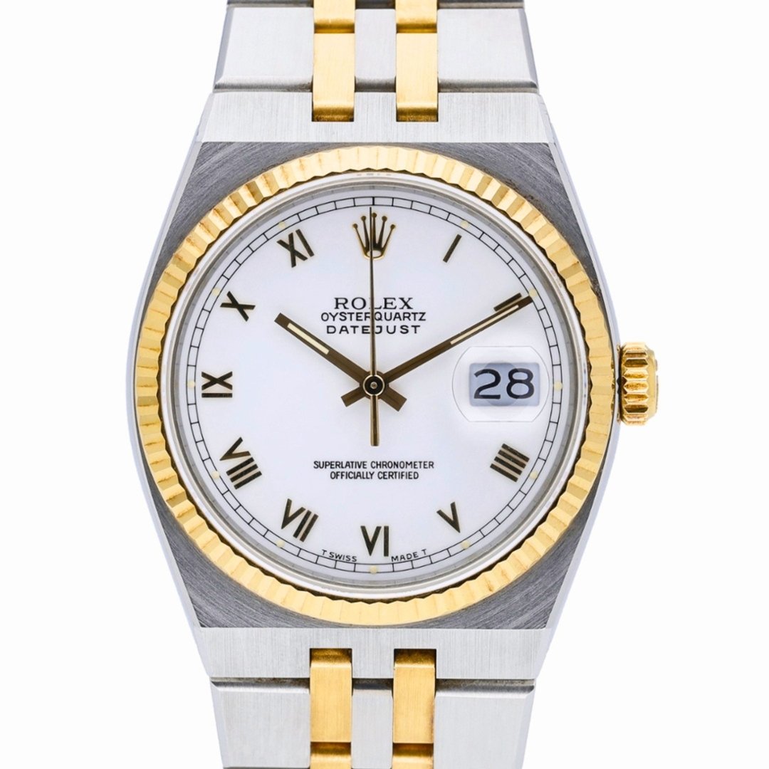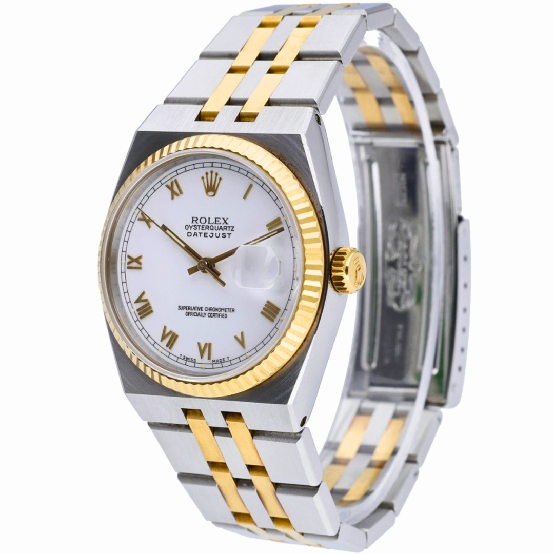 A Rolex Oysterquartz Datejust, model number 17013, is a unique timepiece that marries the precision of a quartz movement with Rolex's timeless style. Crafted in 1982, this watch features a 36mm case made from a striking combination of stainless steel and 18ct yellow gold, offering a luxurious yet robust appearance. The white dial, adorned with Roman numerals, enhances its classic appeal, making it a versatile piece suitable for formal occasions and everyday wear.