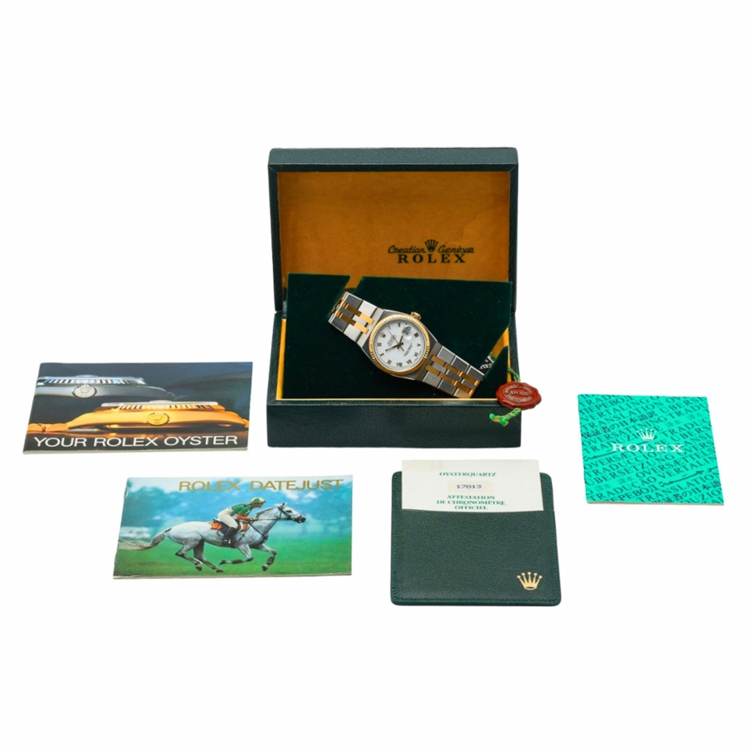 The watch is offered with a 12-month warranty from WLC, ensuring any servicing is covered and that it continues to operate at its best. Additionally, it comes fully boxed and certified, which secures the watch during transportation and enhances its collectibility. Including original paperwork certifies its authenticity and lineage, making it a valuable addition to any collection. The bimetal Rolex Oysterquartz Datejust is not just a timepiece but a piece of history, blending innovation with traditional Rolex craftsmanship.