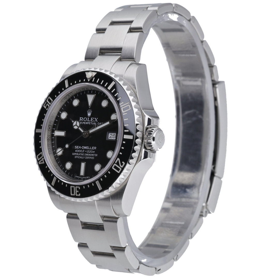 A Rolex Sea-Dweller, reference 116600, is a highly sought-after model celebrated for its perfect balance of classic proportions and modern Rolex engineering. Crafted from stainless steel, this 40mm example features a robust Oyster case, a black Cerachrom bezel, and a matching black dial with crisp Chromalight lume — offering outstanding legibility in all environments. The absence of a Cyclops magnifier preserves the traditional Sea-Dweller aesthetic, giving this model a clean, professional look that collectors truly appreciate.