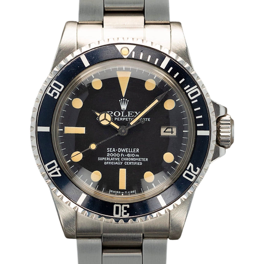 A Rolex Sea-Dweller reference 1665 is a highly important vintage professional dive watch, representing one of the most collectable eras of Rolex tool watch production. Crafted in stainless steel, the 40mm case is paired with a black bezel and black dial featuring attractive, evenly developed patina across the hour markers.