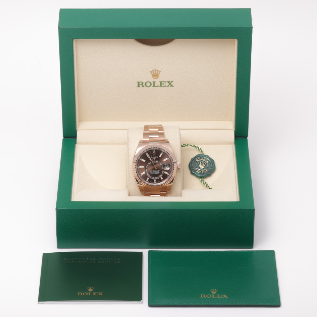 Accompanied by its original full set of Rolex paperwork, presentation box, and a 12-month WLC warranty, this exceptional timepiece offers both collectability and investment appeal. A true showcase of Rolex’s technical mastery and refined design, the 326935 Sky-Dweller in Everose gold with a Chocolate dial remains a standout piece in any serious collection.