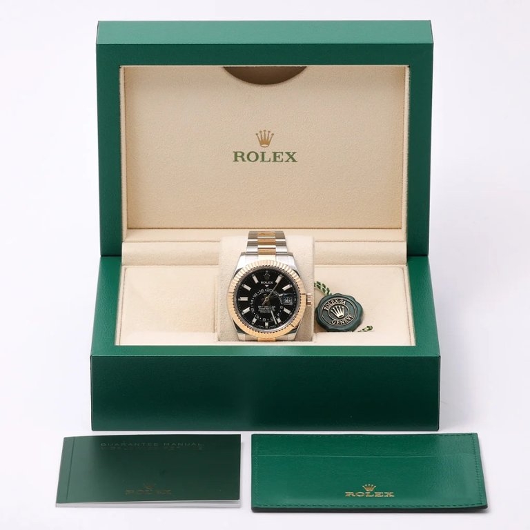 A Bi-Metal Rolex Sky-Dweller (Model: 326933), introduced in 2021, is designed with the discerning customer in mind, offering a perfect blend of luxury, precision, and practicality. Its 42mm case, crafted from stainless steel and 18ct yellow gold, ensures durability while exuding a timeless elegance. The black dial provides a striking, modern contrast to the polished hour markers and hands, ensuring legibility even in low-light conditions.