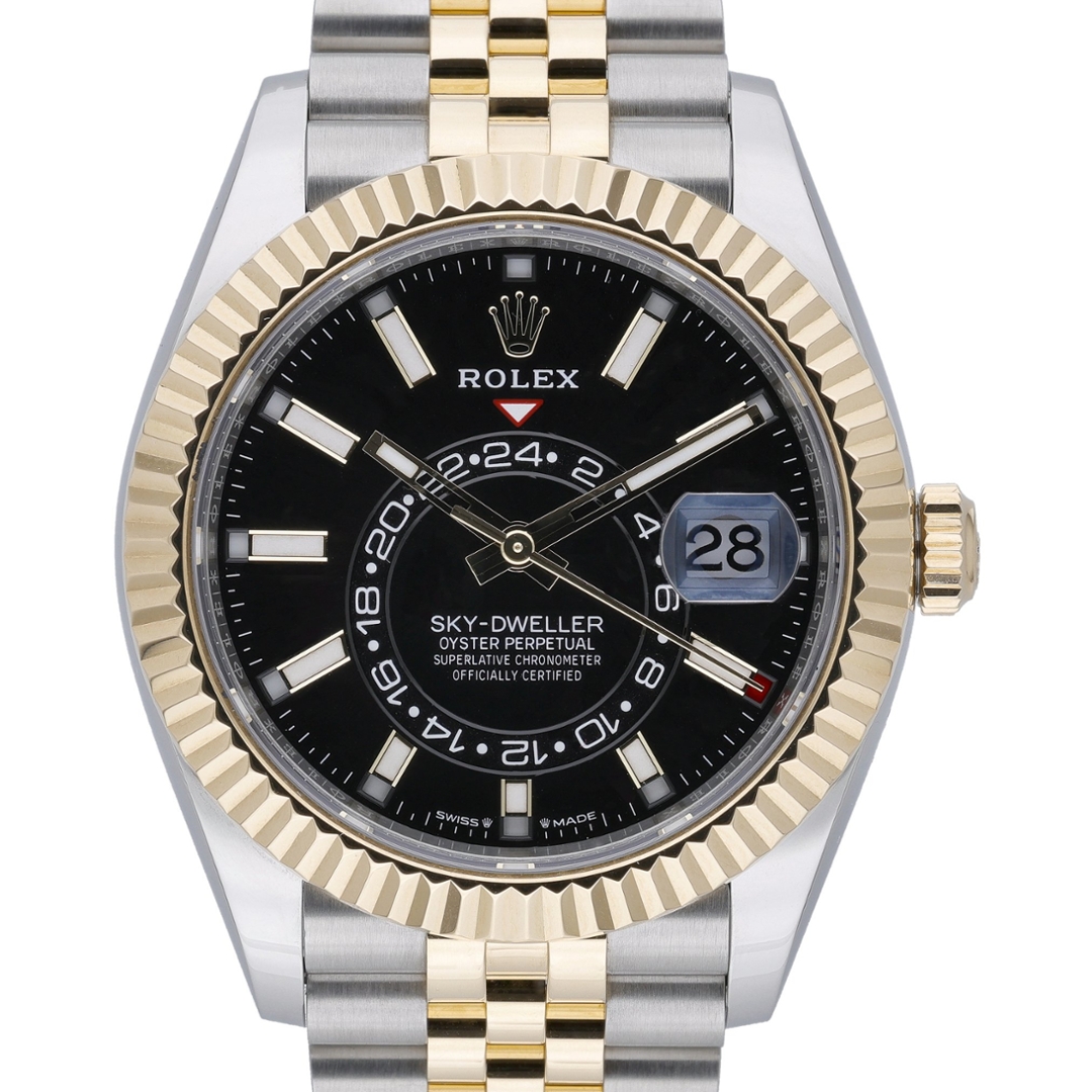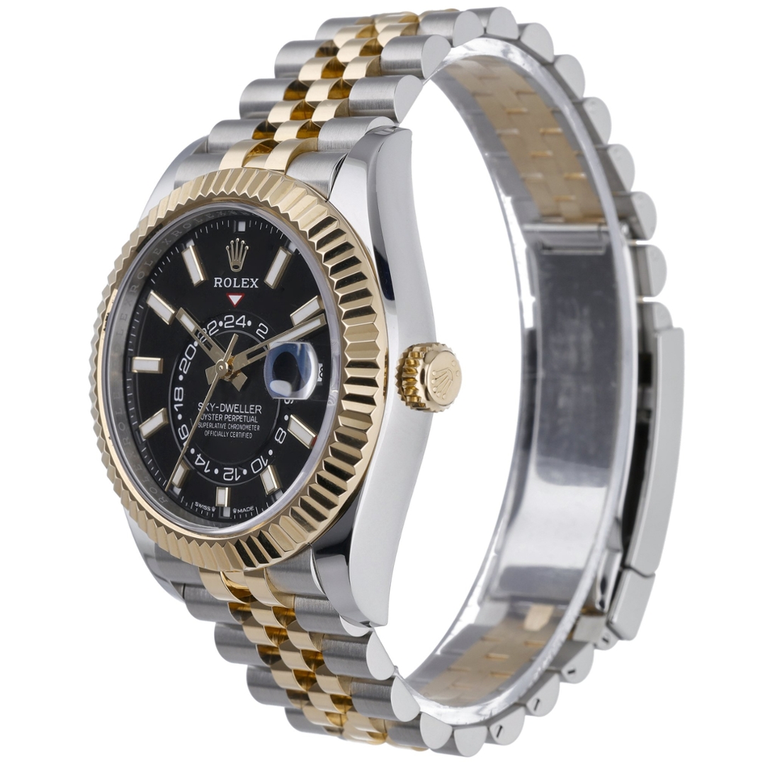 A bi-metal Rolex Sky-Dweller Watch, a fusion of stainless steel and 18ct yellow gold, exudes sophistication and refinement. Featuring a sleek black dial, this timepiece is both striking and elegant, making a bold statement on the wrist.