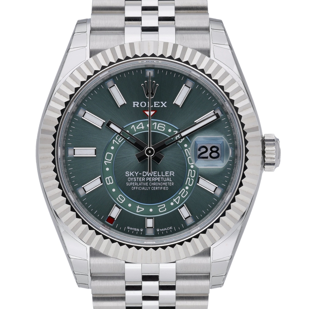 A Rolex Sky-Dweller 336934, crafted from stainless steel and crowned with an 18ct white gold fluted bezel, paired perfectly with a striking green dial that radiates contemporary prestige. One of the most technically sophisticated watches in the Rolex lineup, the Sky-Dweller masterfully combines dual-time functionality with an annual calendar—an ingenious design for those who travel the world yet value precision and elegance.