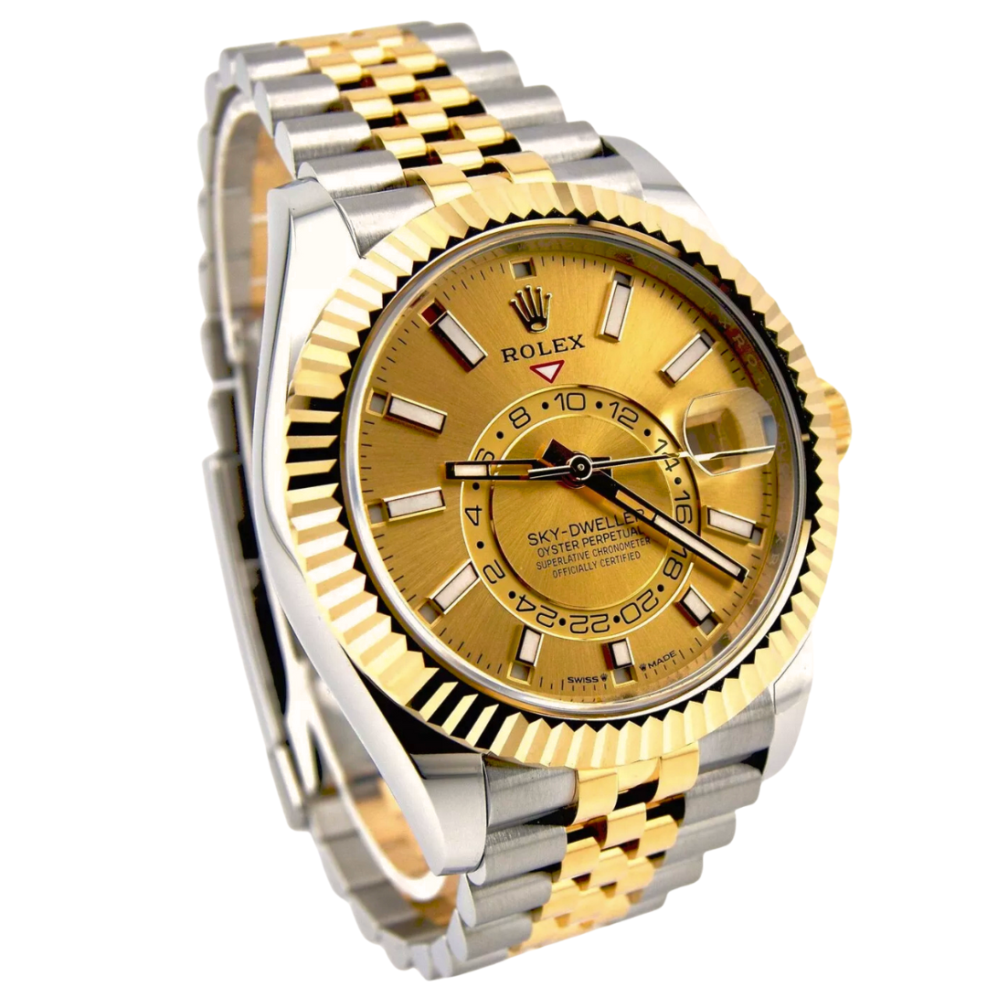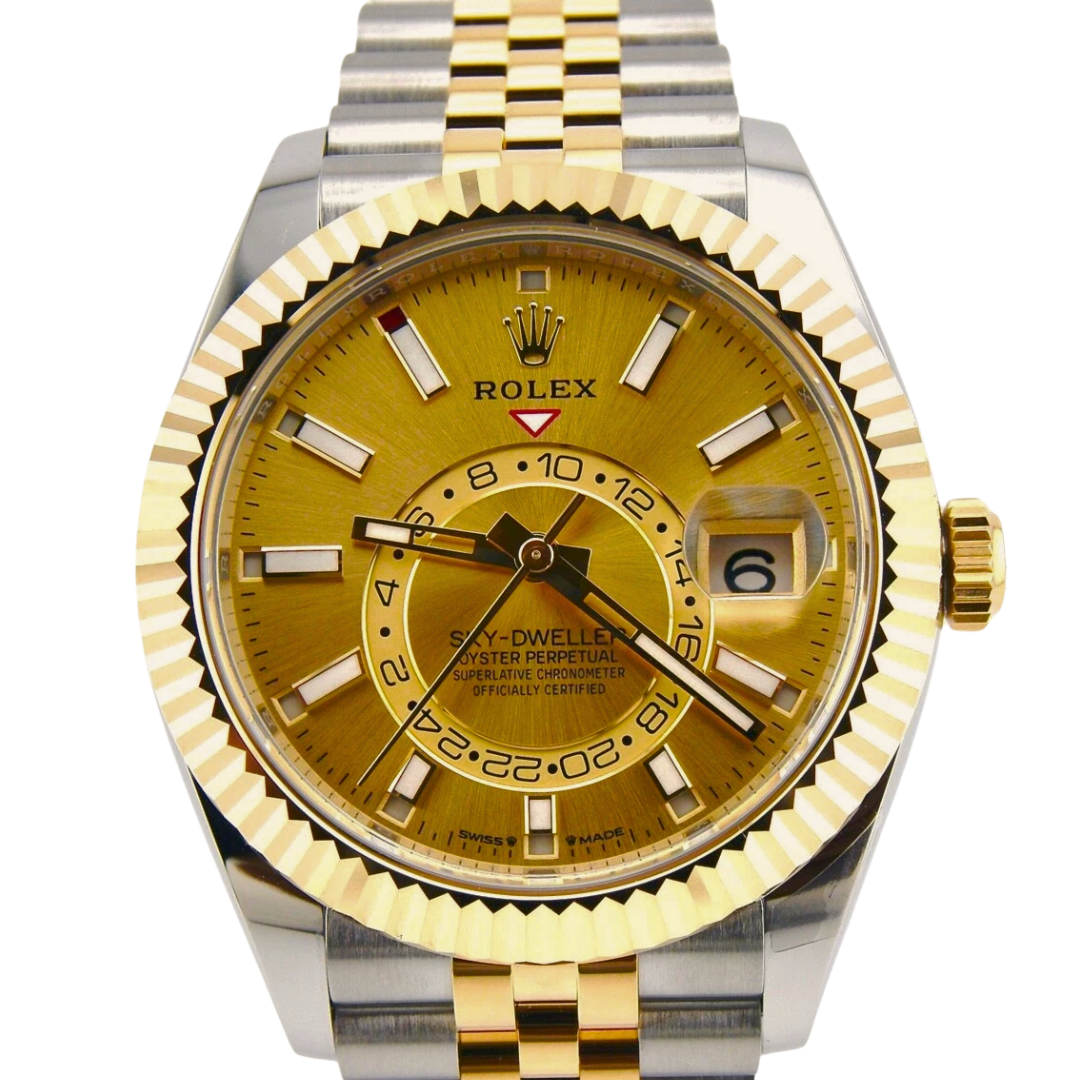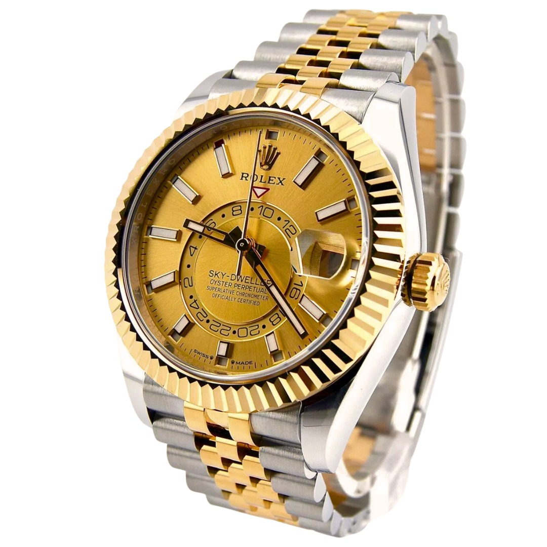 A Bi-Metal Rolex Sky-Dweller, model 336933, stands among the most sophisticated and commanding watches in the Rolex collection. Crafted from stainless steel and 18ct yellow gold, this 42mm masterpiece showcases a harmonious blend of prestige and innovation. The champagne sunray dial exudes warmth and refinement, complemented by luminous baton hour markers, gold hands, and the distinctive off-centre 24-hour disc that enables effortless dual-time zone reading — a signature feature of the Sky-Dweller line.