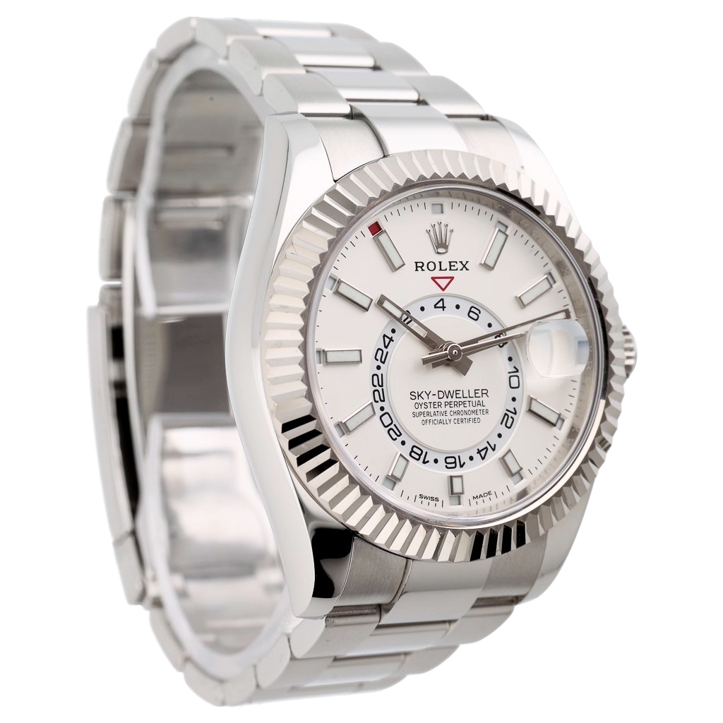 A Rolex Sky-Dweller is a masterpiece of engineering and elegance, designed for those who appreciate the finest in horology. This 2021 model showcases an exquisite blend of stainless steel and 18ct white gold, offering a perfect balance of durability and luxury. The 18ct white gold fluted bezel enhances its distinguished appearance, framing the pristine white dial, which exudes sophistication and clarity. With a 42mm case size, the watch commands attention on the wrist while maintaining Rolex’s signature refinement.