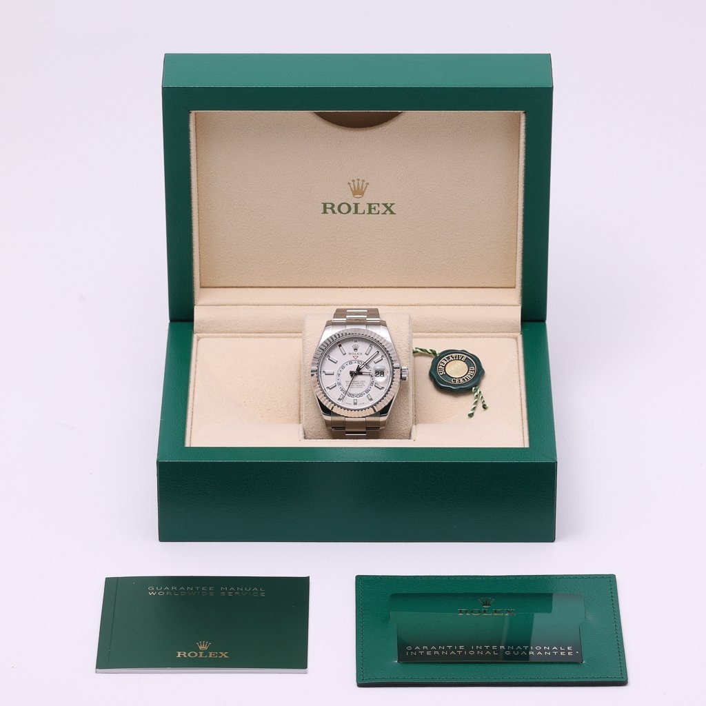 This immaculate Sky-Dweller is presented as a full set, complete with its original paperwork, Rolex box, and certification, ensuring authenticity. Backed by a 12-month WLC warranty, this exceptional timepiece represents a luxury watch and a statement of achievement and impeccable taste.