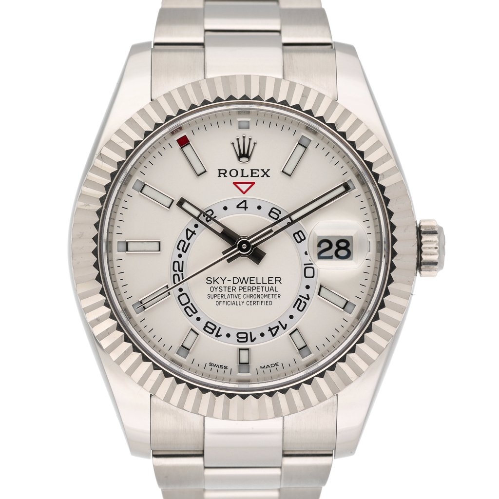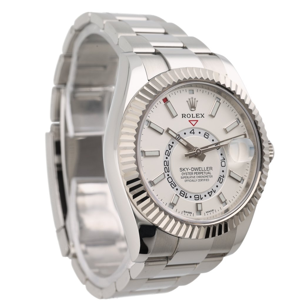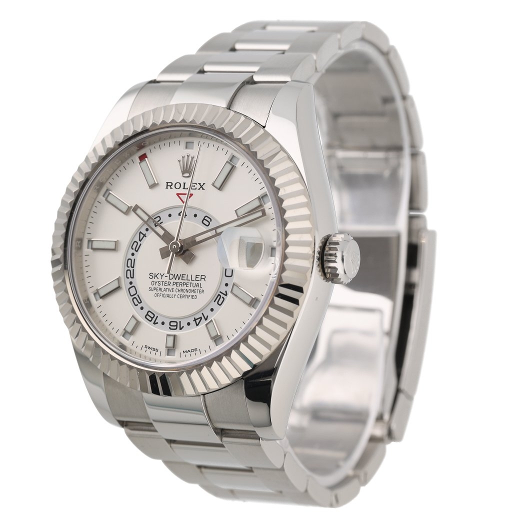 A Rolex Sky-Dweller 326934 is presented in stainless steel with an 18ct white gold fluted bezel, paired with a crisp white dial that highlights the model’s distinctive annual calendar layout. The 42mm Oyster case offers a strong yet balanced presence on the wrist, while luminous baton hour markers, off-centre 24-hour disc and the month indication around the dial provide excellent clarity and intuitive functionality.