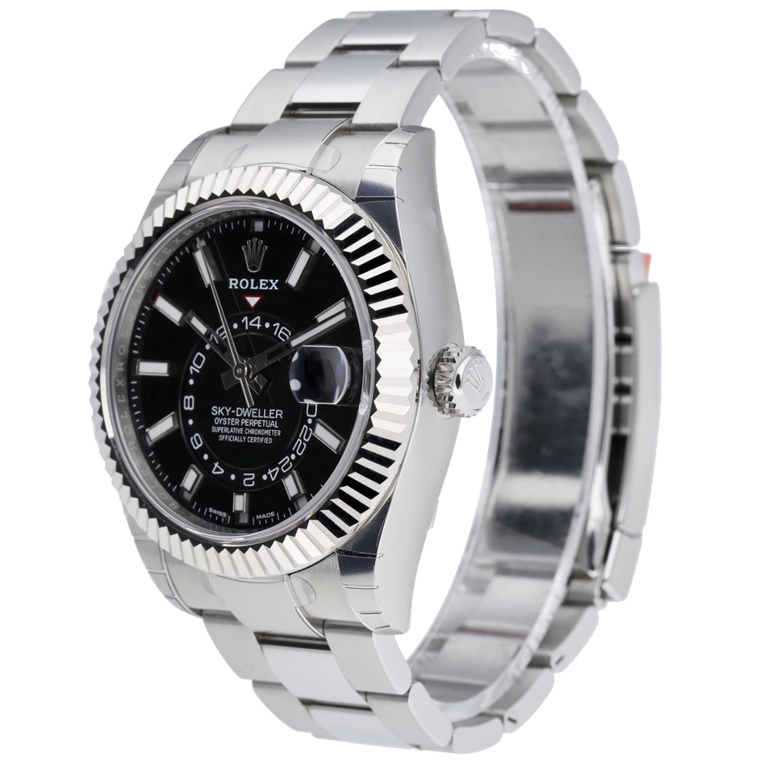 A Rolex Sky-Dweller 326934, crafted in stainless steel and featuring an 18ct white gold fluted bezel with a sleek black dial — a bold, refined combination in one of Rolex’s most technically sophisticated models. With a 42mm Oyster case and commanding profile, this reference pairs advanced function with unmistakable Rolex elegance.