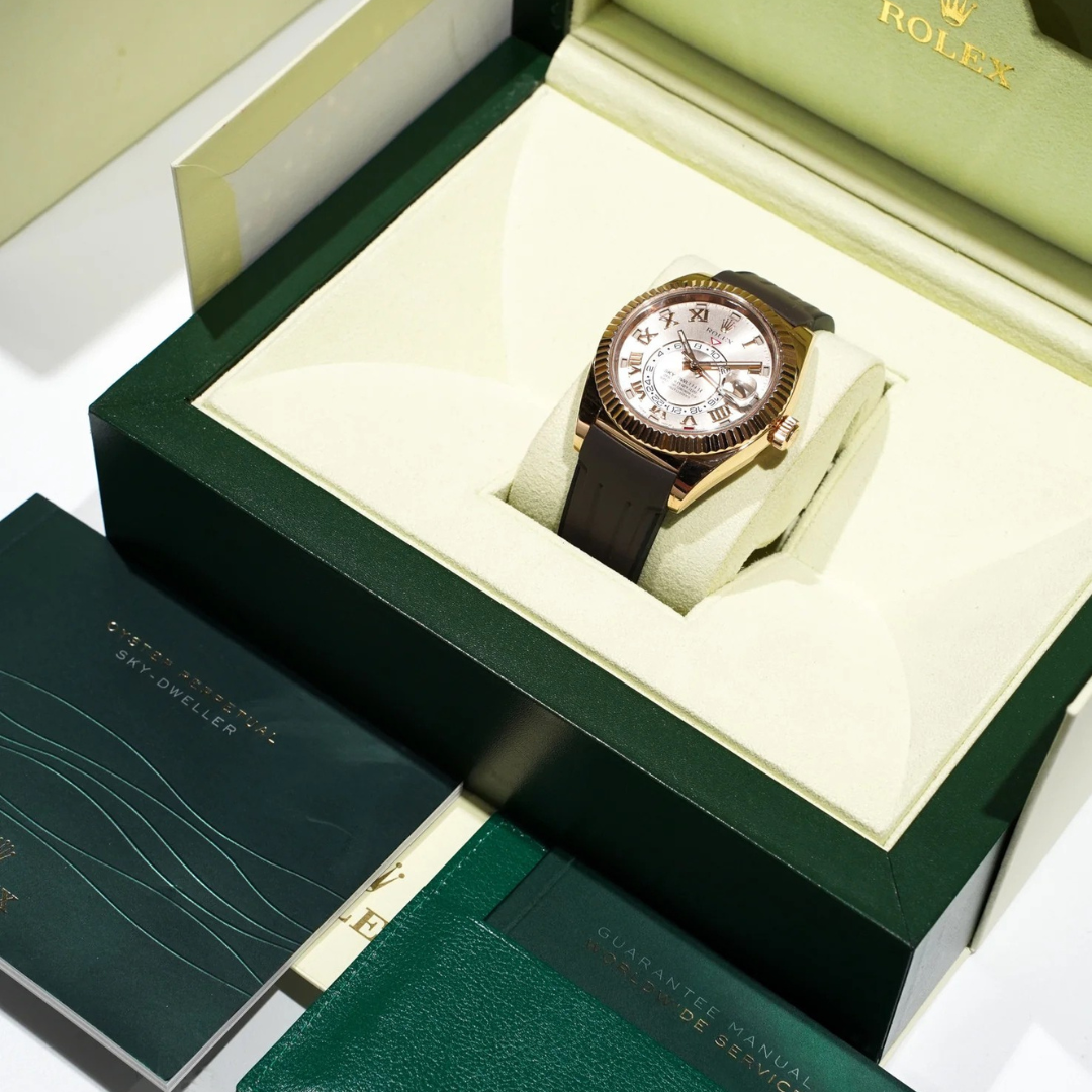 This Rolex Sky-Dweller reference 326135 is crafted in full 18ct Everose gold and paired with a distinctive Sundust dial featuring applied Roman numerals. The 42mm case is fitted with Rolex’s Ring Command fluted bezel, allowing intuitive adjustment of its advanced calendar and dual time functions while maintaining a refined, contemporary presence on the wrist.