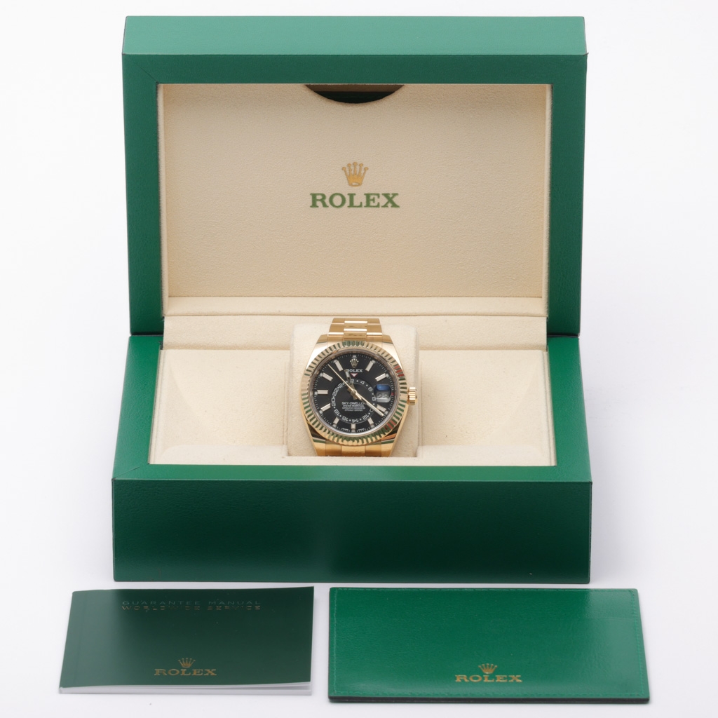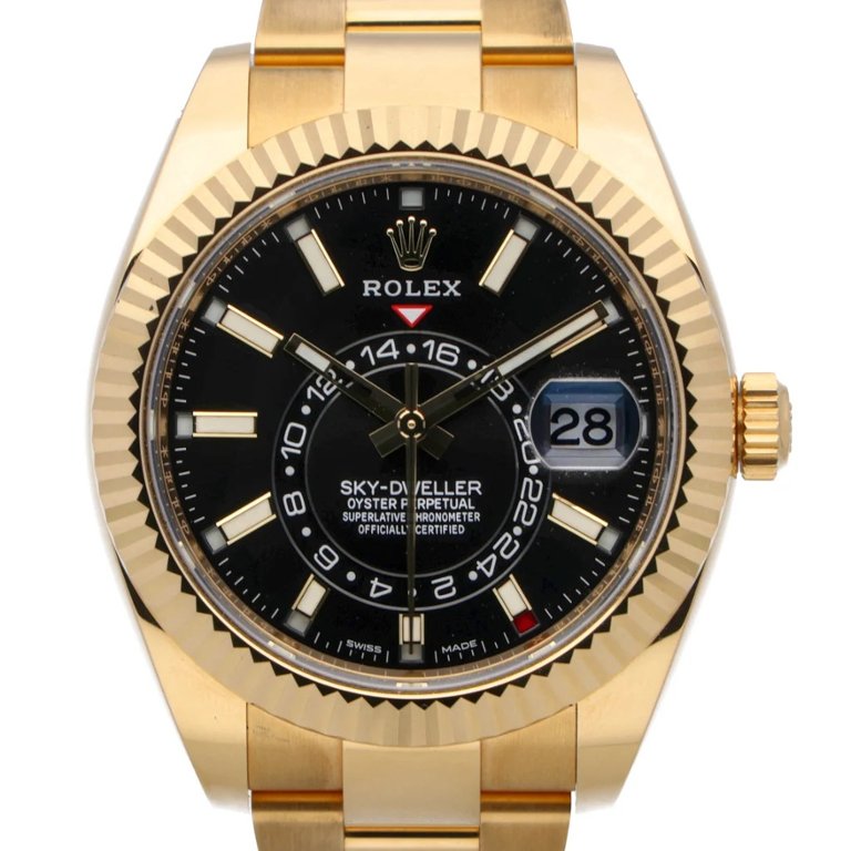 A Rolex Sky-Dweller reference 326938 in full 18ct yellow gold, featuring a commanding 42mm case and striking black dial. The fluted Ring Command bezel works seamlessly with the annual calendar and dual time display, offering both presence and practicality. The rich gold Oyster bracelet completes a configuration that remains one of the most sought-after in the Sky-Dweller range.