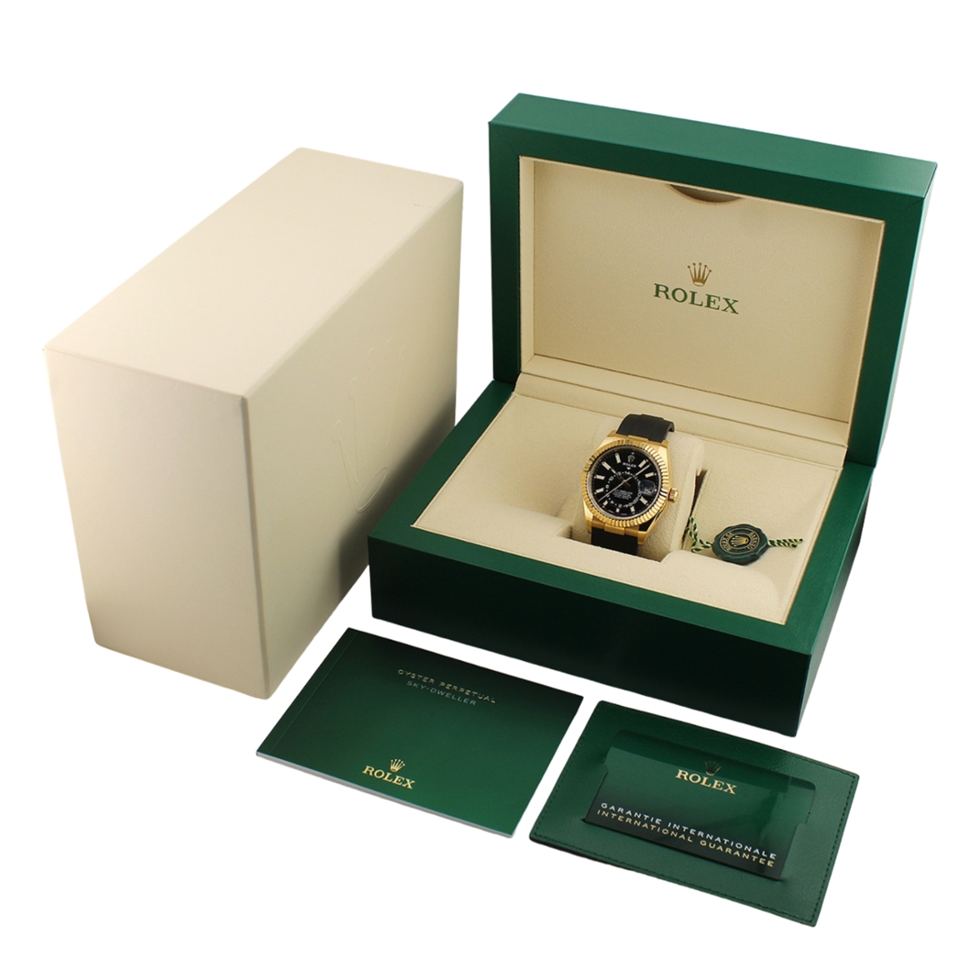 A Rolex Sky-Dweller reference 326938 is a striking example of Rolex’s most technically sophisticated travel watch, executed entirely in solid 18ct yellow gold. The 42mm case is paired with the black Oysterflex rubber strap and matching gold Oysterclasp, offering a modern, sport-luxury presence. Produced in 2021, this watch is presented in immaculate condition and remains one of the most distinctive Sky-Dweller configurations.