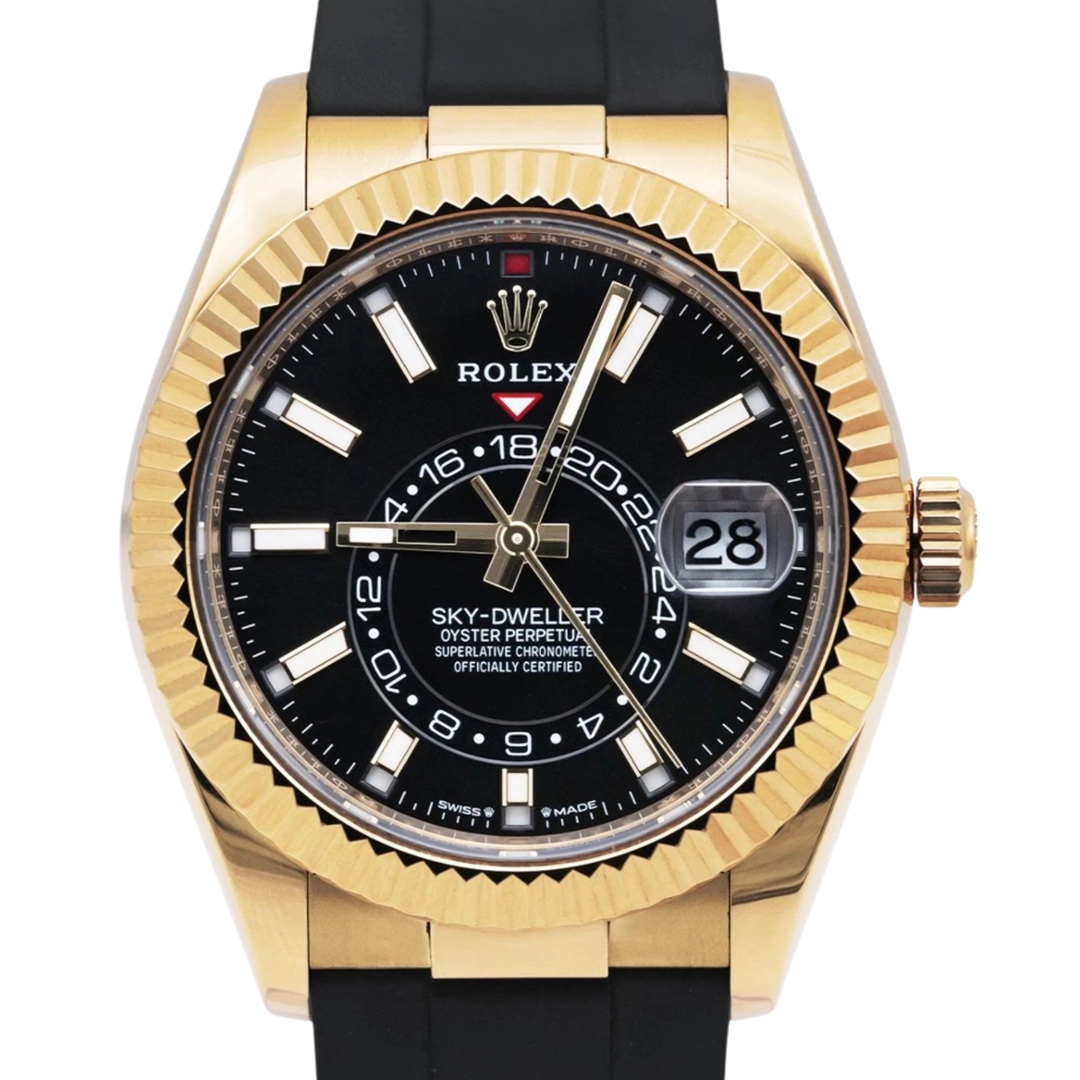 A Rolex Sky-Dweller Watch, Black Rubber Strap with an 18ct Yellow Gold Case & Clasp with an 18ct Yellow Gold Fluted Bezel on a Black Dial