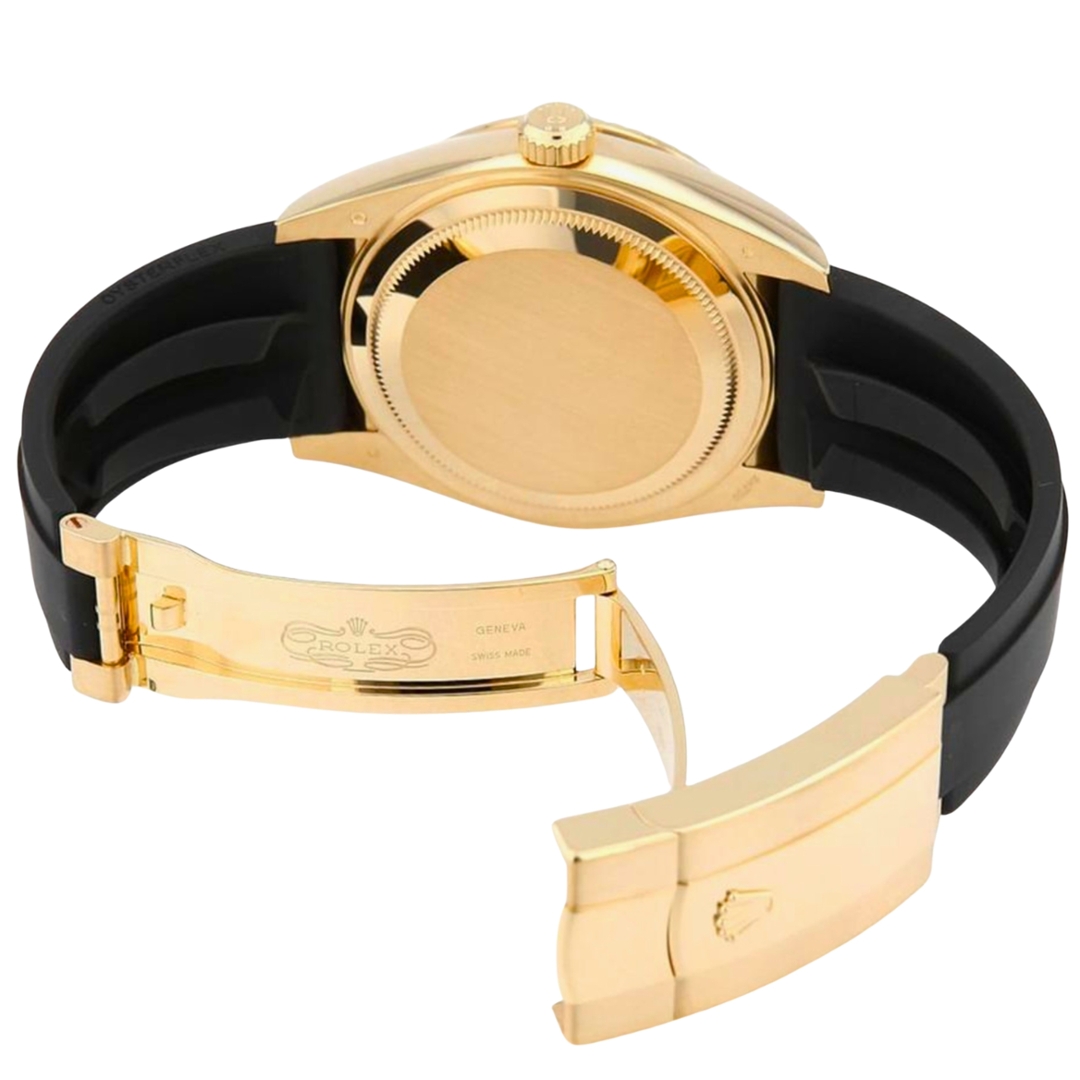 A Rolex Sky-Dweller 336238 is a testament to Rolex's unparalleled watchmaking mastery, blending sophistication, innovation, and timeless luxury. This extraordinary timepiece boasts a robust 42mm 18ct yellow-gold case and a matching yellow-gold bezel, exuding opulence from every angle. Its black dial, adorned with luminous hour markers and elegant gold accents, ensures effortless readability while maintaining a refined aesthetic. The durable yet stylish black Oysterflex rubber strap is secured with an 18ct yellow gold clasp, delivering a modern twist to this classic icon.