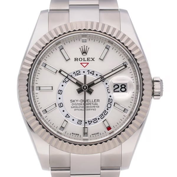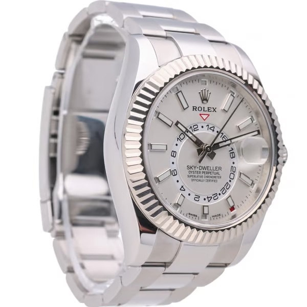 A Rolex Sky-Dweller, model number 326934, is an exceptional timepiece that showcases Rolex’s mastery of both elegance and engineering. Released in 2018, this watch is crafted from stainless steel, ensuring durability while maintaining a sleek, modern appearance. The standout feature is the 18ct white gold fluted bezel, adding a touch of luxury and distinction to its design.
