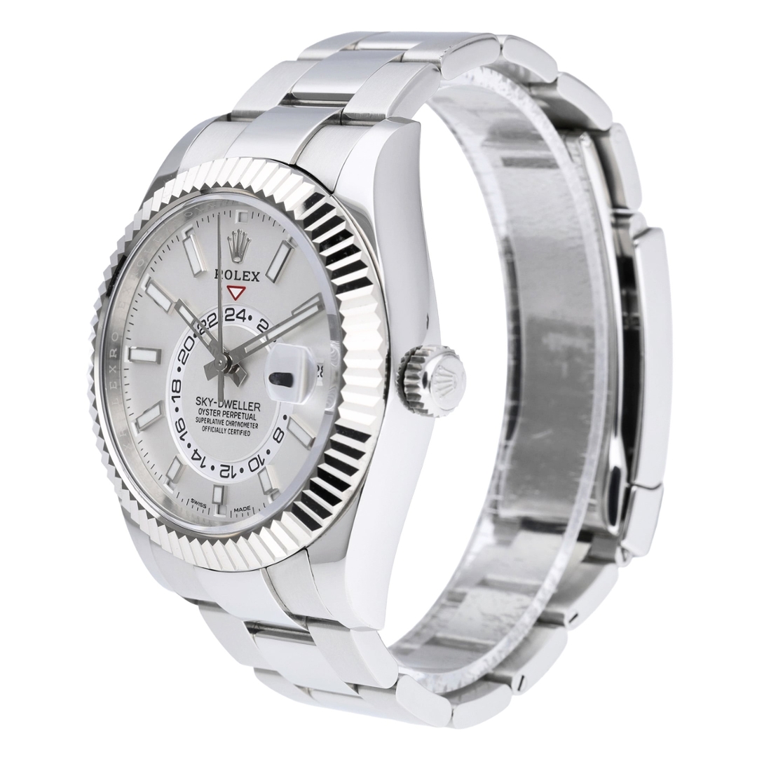 A Rolex Sky-Dweller 326934 is presented in stainless steel with an 18ct white gold fluted bezel, paired with a crisp white dial that highlights the model’s distinctive annual calendar layout. The 42mm Oyster case offers a strong yet balanced presence on the wrist, while luminous baton hour markers, off-centre 24-hour disc and the month indication around the dial provide excellent clarity and intuitive functionality.