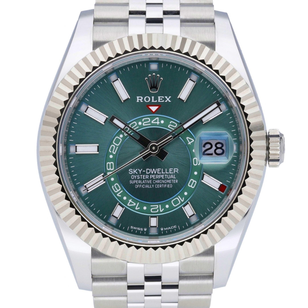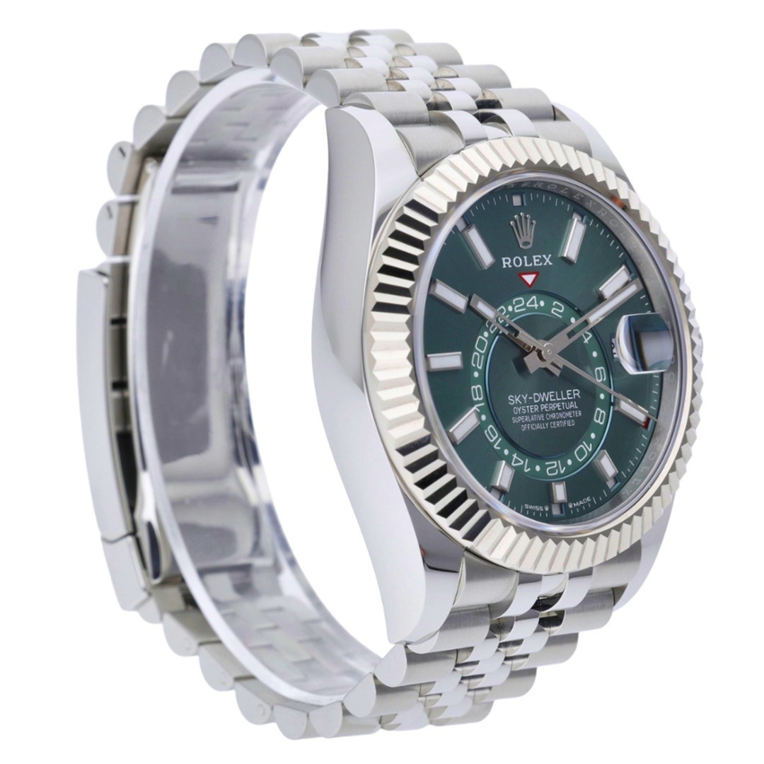 A Rolex Sky-Dweller 336934, presented in a 42mm Oyster case crafted from stainless steel with an 18ct white gold fluted bezel, representing one of Rolex’s most advanced and prestigious complications. The green sunburst dial delivers a bold and highly sought-after aesthetic, complemented by luminous baton hour markers and hands for exceptional legibility. The off-centre 24-hour disc enables dual time zone tracking, while the Cyclops lens at 3 o’clock magnifies the date, and the Ring Command bezel allows intuitive adjustment of the annual calendar and time functions.