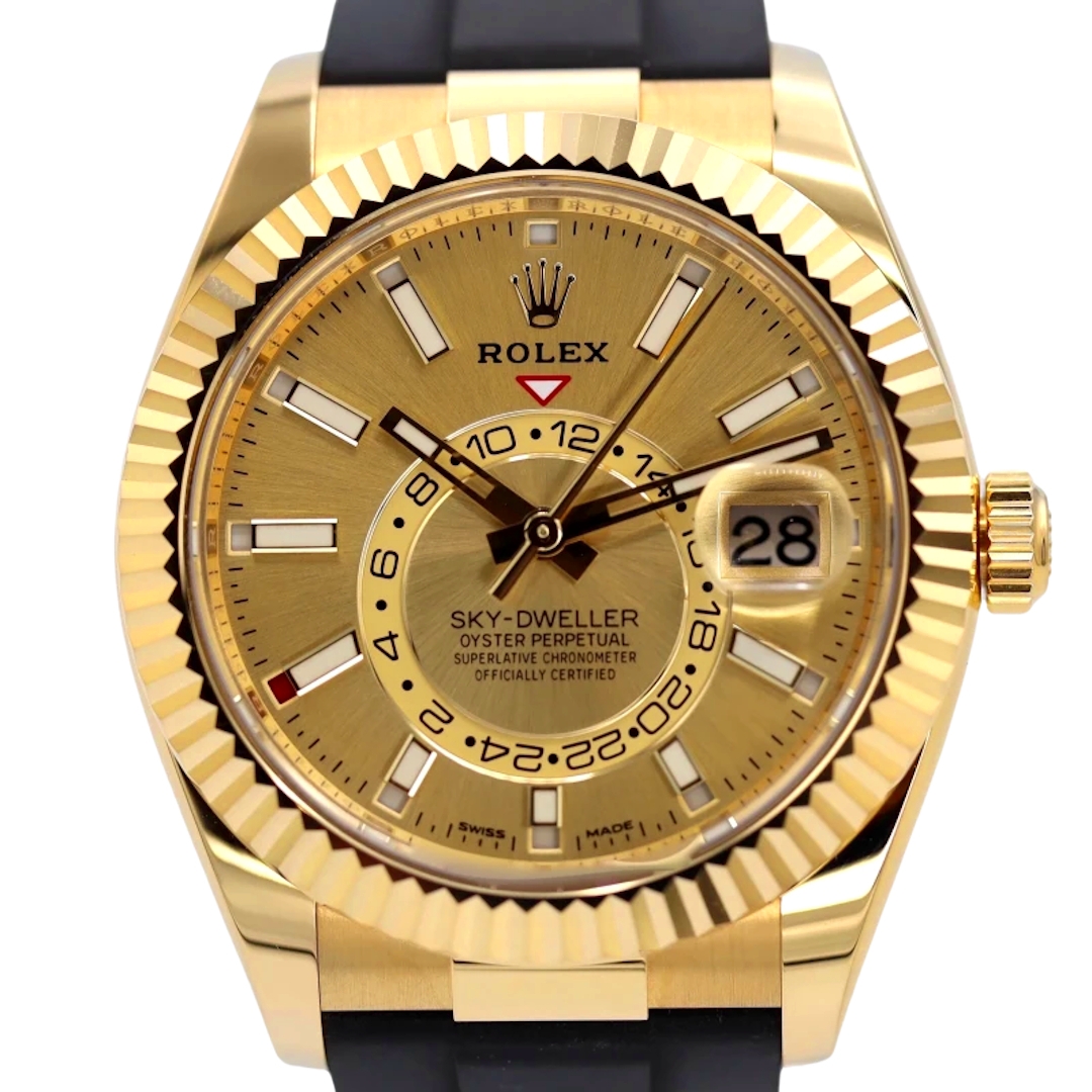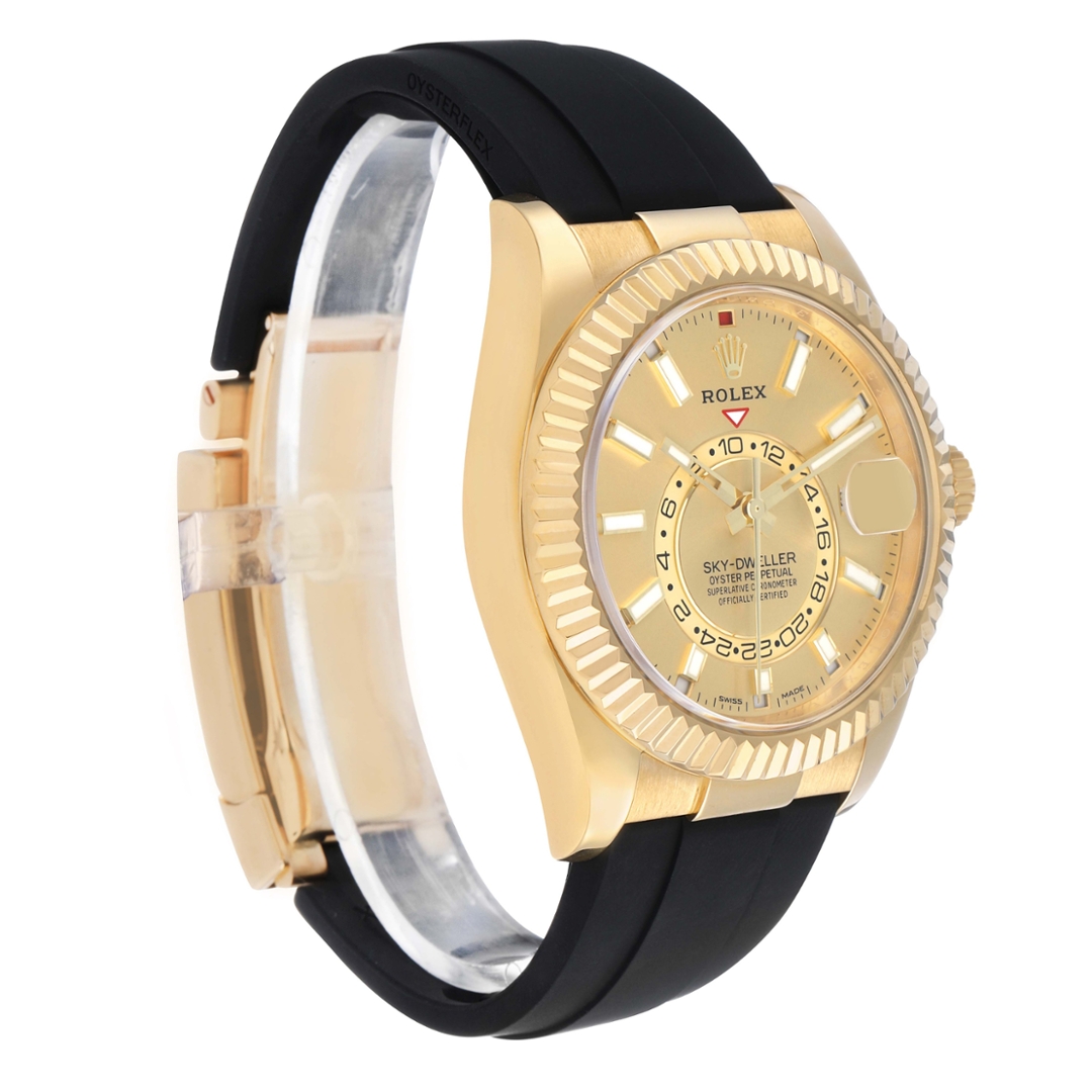 A Rolex Sky-Dweller reference 326238 in full 18ct yellow gold, fitted to a black Oysterflex bracelet with a matching yellow gold clasp and presented on a champagne dial. This 2021 example is offered in immaculate condition and combines the prestige of precious metal with the contemporary sport-luxury feel of the Oysterflex configuration. The commanding fluted bezel complements the 42mm case, while the champagne dial provides a glowing appeal against the warmth of yellow gold, delivering a strong wrist presence with refined balance.