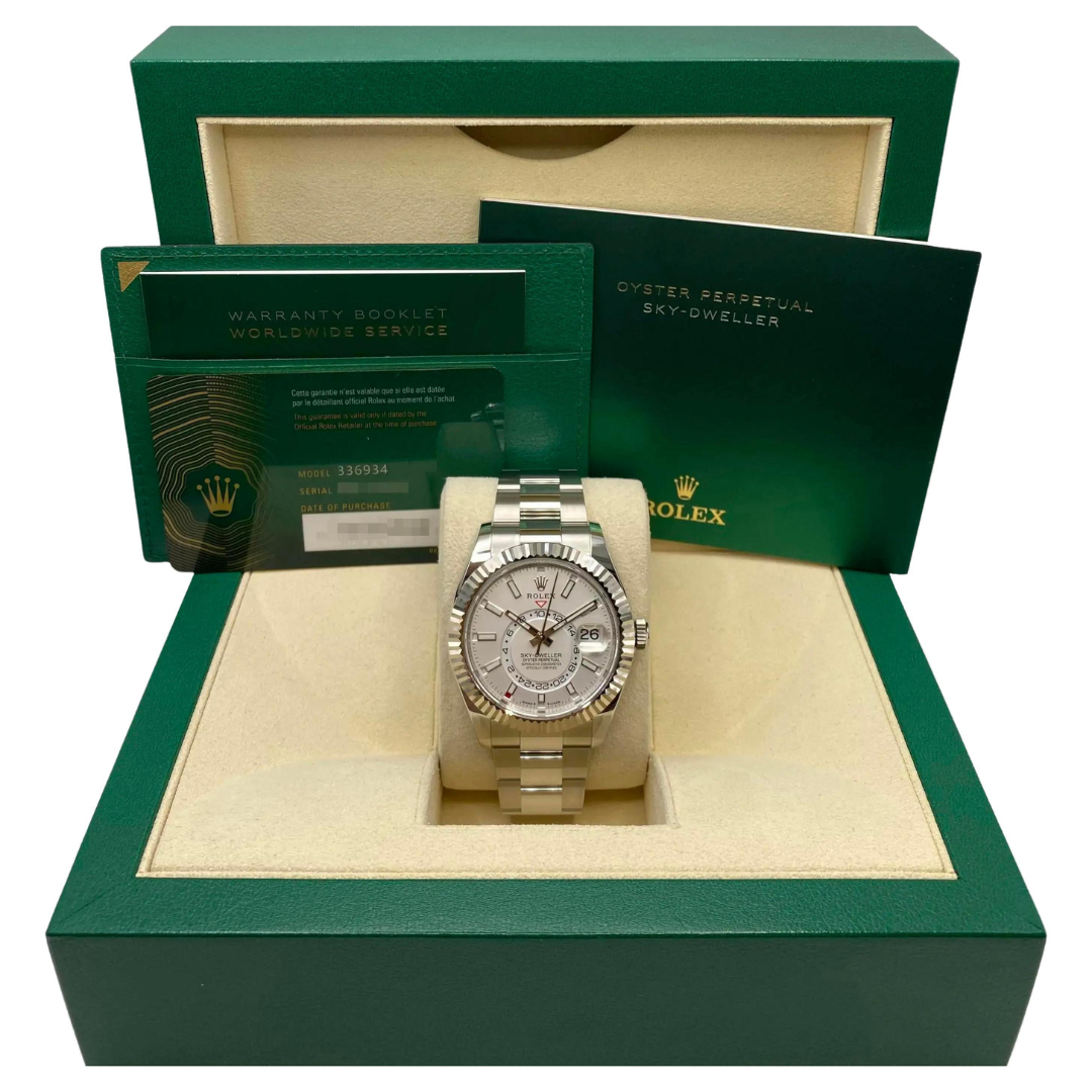 A Rolex Sky-Dweller reference 336934 in stainless steel and 18ct white gold, presented with a crisp, highly legible, intense white dial. As one of Rolex’s most advanced timepieces, the Sky-Dweller seamlessly integrates dual time functionality with an annual calendar, offering both technical sophistication and everyday usability in a refined package.