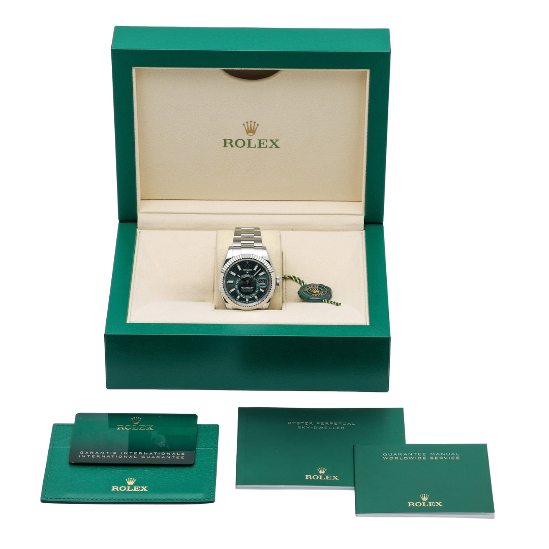A Rolex Sky-Dweller Watch, Stainless Steel with an 18ct White Gold Fluted Bezel on a striking Mint Green Dial. This highly desirable modern configuration showcases one of Rolex’s most advanced complications, combining bold aesthetics with exceptional functionality. The vibrant dial brings a contemporary edge to the classic Sky-Dweller design, while the 42mm case and Oyster bracelet provide a balanced presence on the wrist, suited to both daily wear and more refined occasions.
